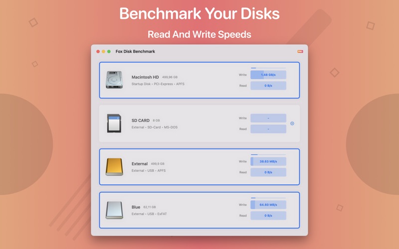 The Magic Disk Benchmark can measure the read and write performance of your drives. The app will perform a five second write and read test.