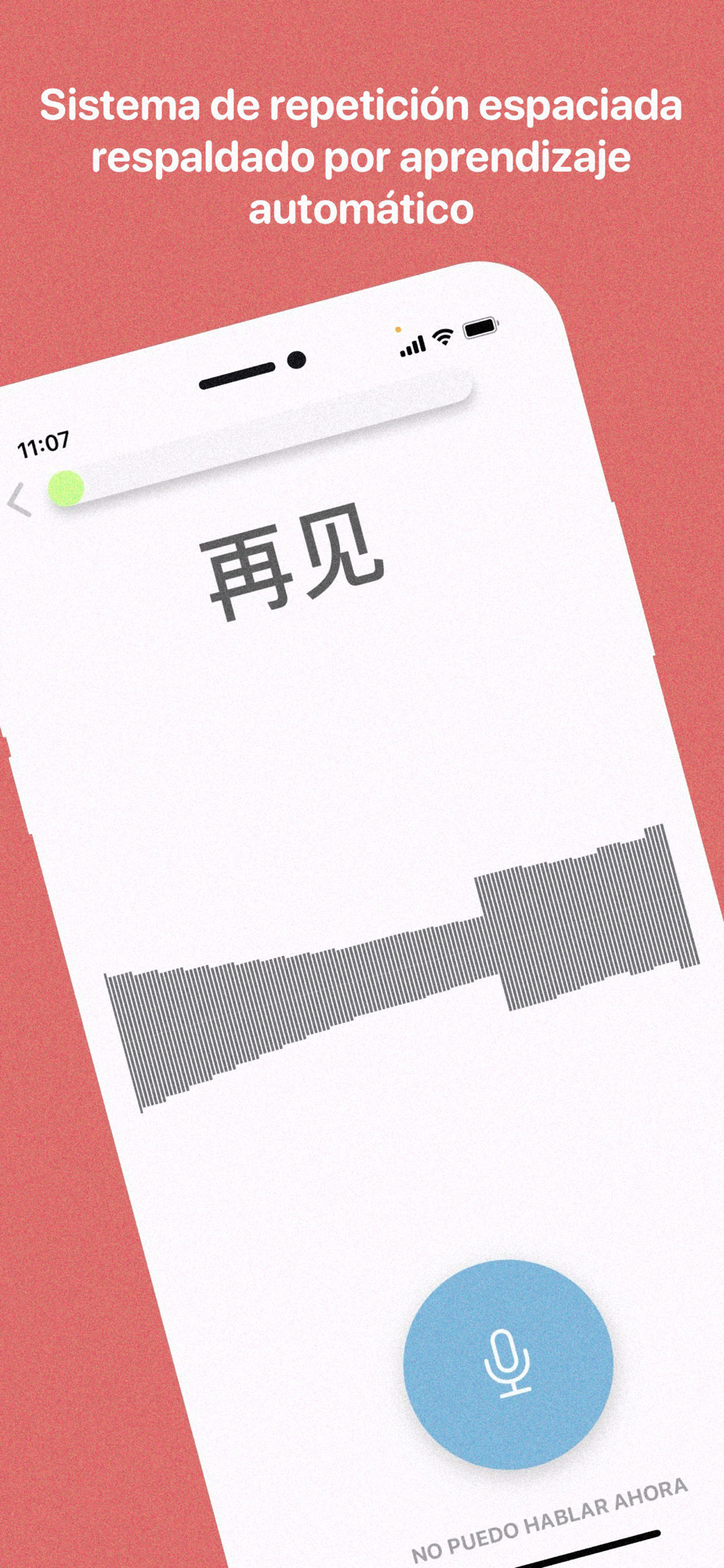 Comenzamos con un sistema de repetición espacial científicamente probado. Llevamos ese sistema a los límites mediante el uso de algoritmos de aprendizaje automático. La aplicación Aprenda Chino monitorea continuamente tus respuestas, con el fin de generar las mejores lecciones para ti, y elegir así las palabras que realmente necesitas aprender. Repetirás las palabras en el momento adecuado y con tanta frecuencia como necesites, para así obtener una comprensión sólida de la lección.