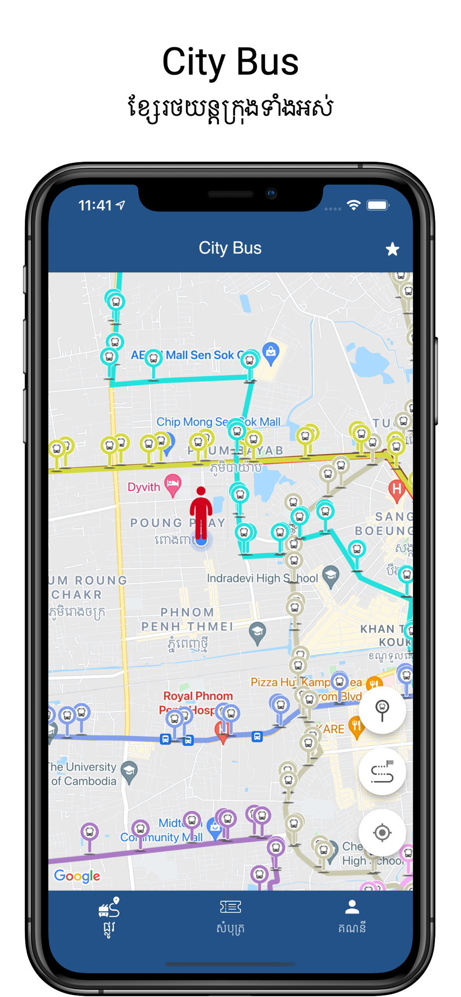 City Bus App is an application which provides information of Phnom Penh City Bus such as real time bus location, all available routes, search a specific route, and bus stops, ..etc.