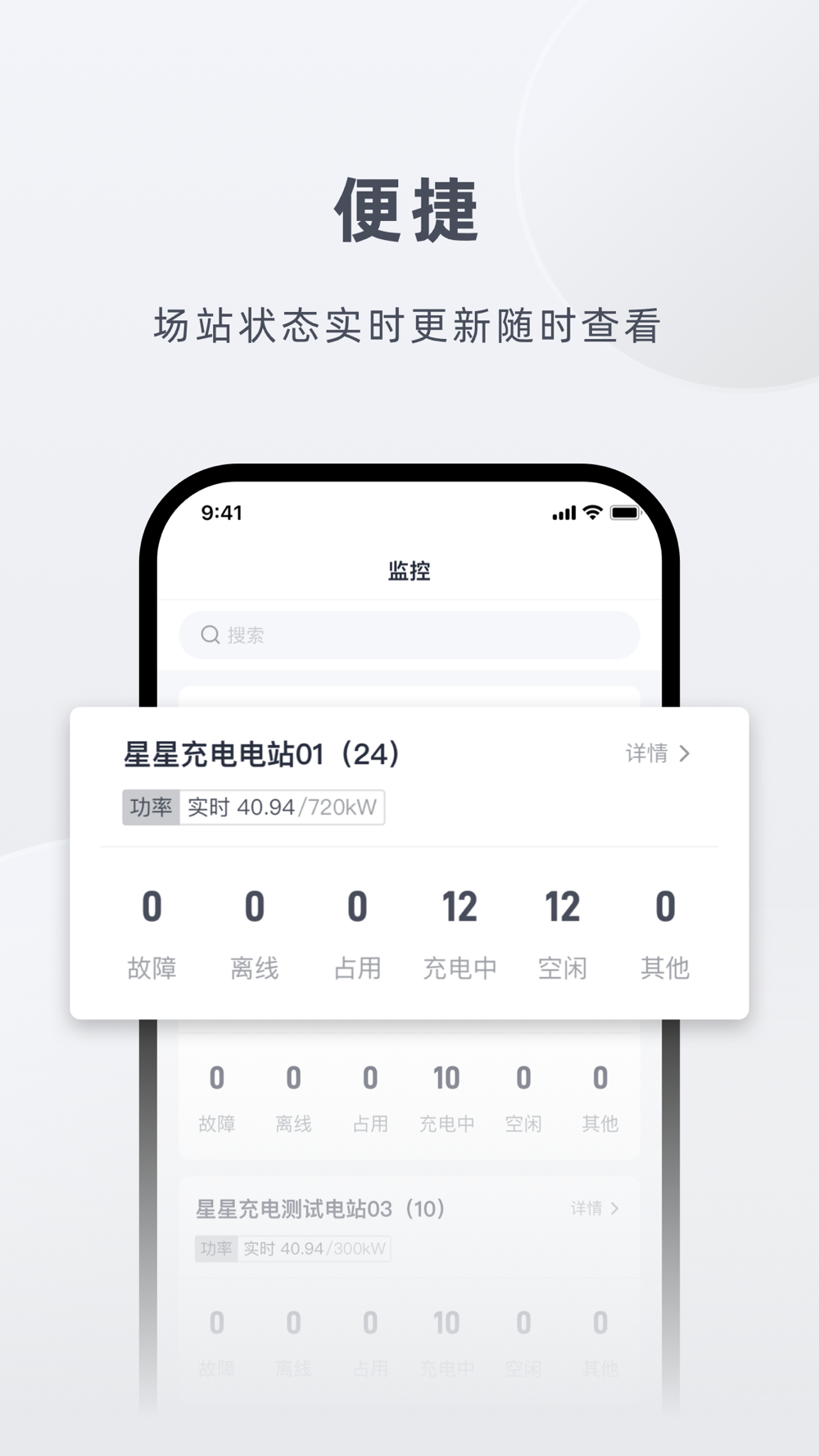 2、展示电站终端主要状态信息(故障、空闲、充电中)