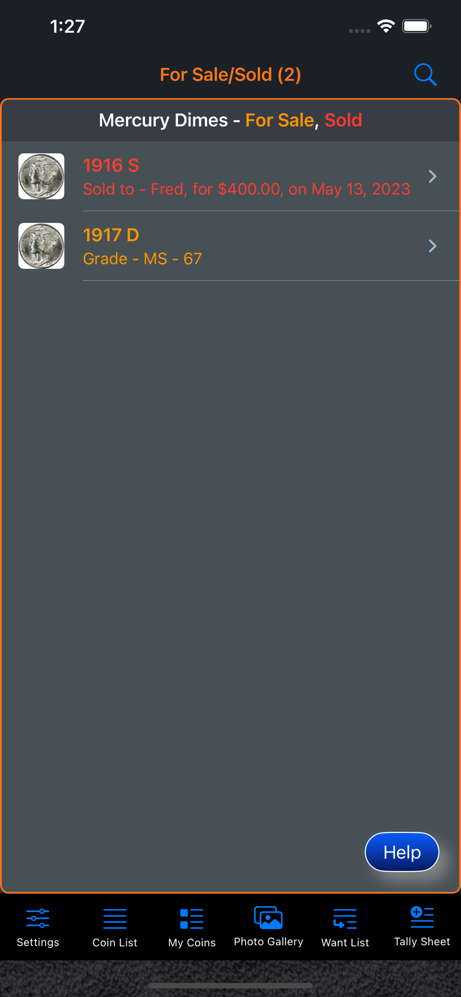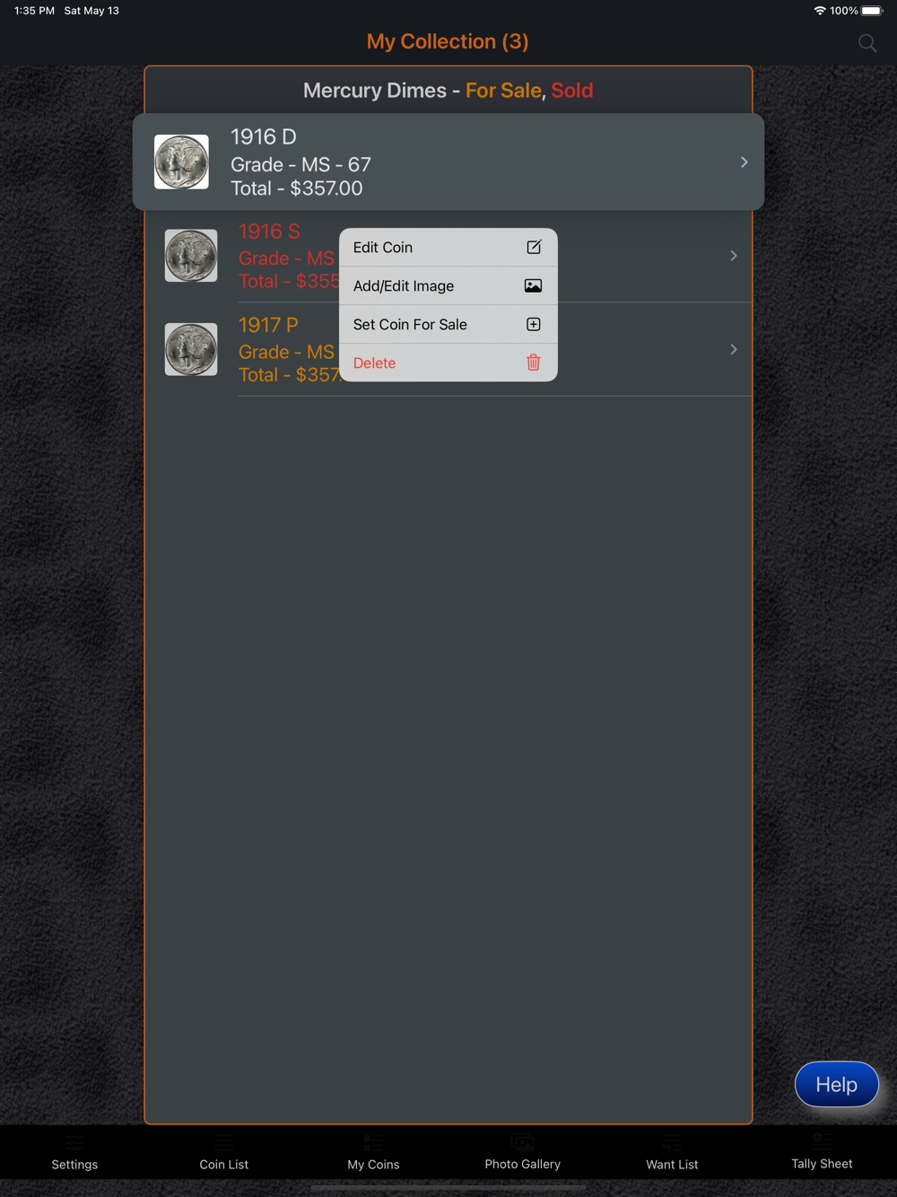 This app will provide the ability for the user to organize, track and manage their collection of coins. Images of each coin can be included with the collection. There is also a means within the app for the user to peruse all of the images in an entertaining manner. The app has three (3) color themes which help to make the app more enjoyable. A running tally of the cost for the entire collection is provided. A want list is also included in the app to allow you to ear-mark coins that you are searching for.