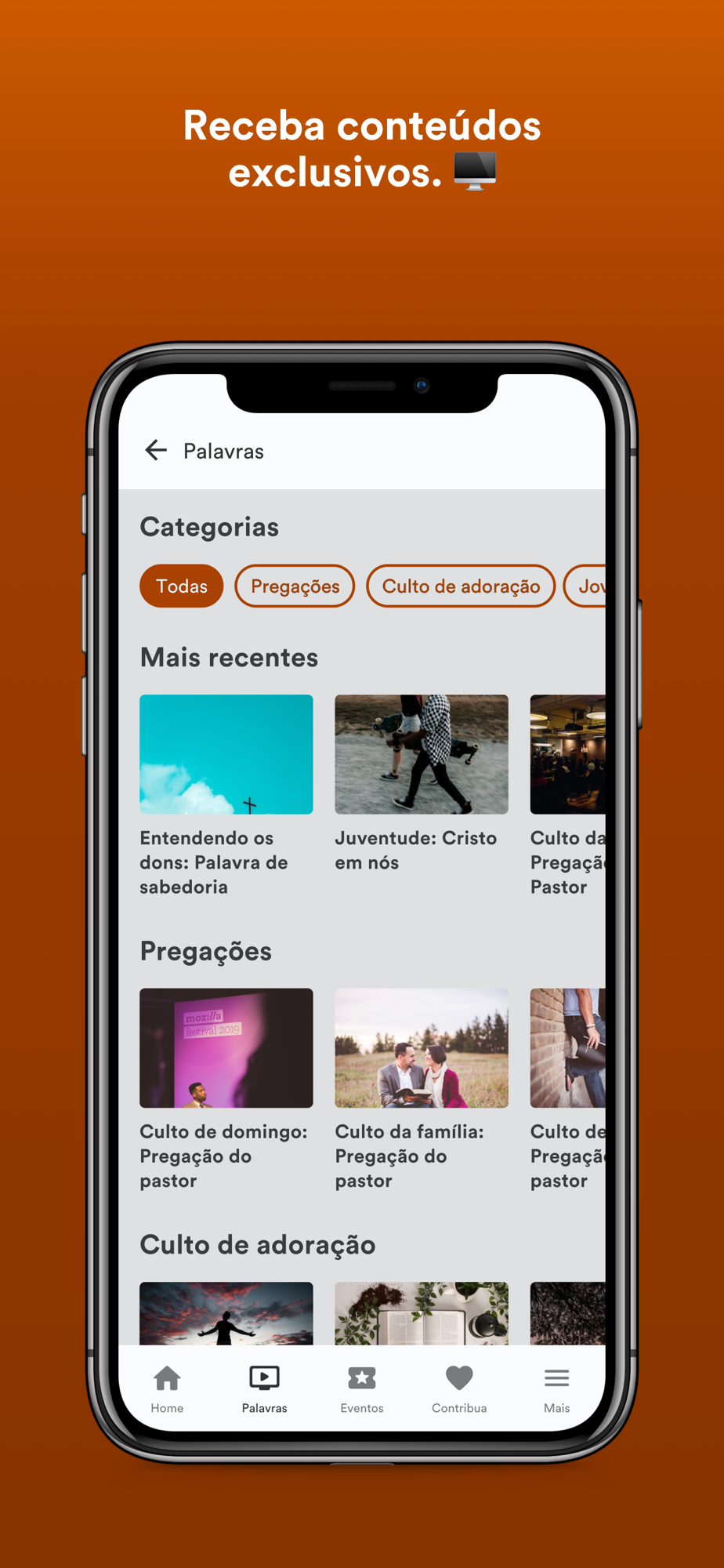 - Siga a agenda e fique por dentro de tudo que acontece na igreja, inscreva-se em eventos e tenha seus ingressos sempre com você.