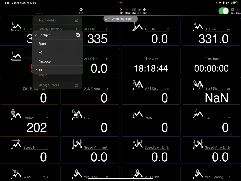 eVario is a 9-axis measurement (accelerometer, gyrometer, gps), barometer assisted, connected and intuitive instrument with a polychrom display, exploiting the embedded device’s hardware and accurate sensoric, without need to connect external devices. It typically provides real time information of a variometer like altimeter, speedometer, odometer, chronometer, gyrometer, anemometer for every (air)craft pilot. Its configurable cockpit allows you to keep track of the most relevant to you. The integrated data logger automatically records your 3D location and provides the recorded track file to your iCloud for track visualisation or flight metrics.