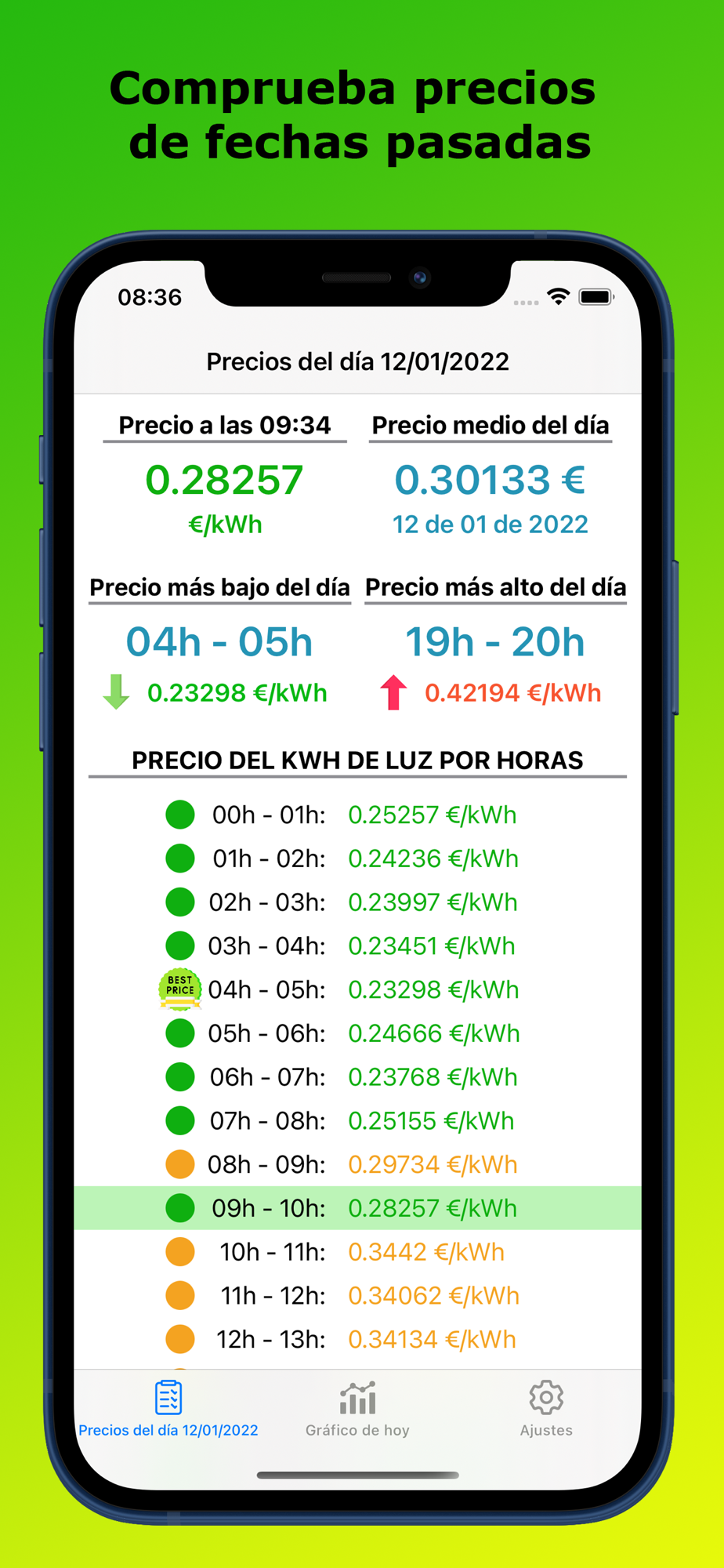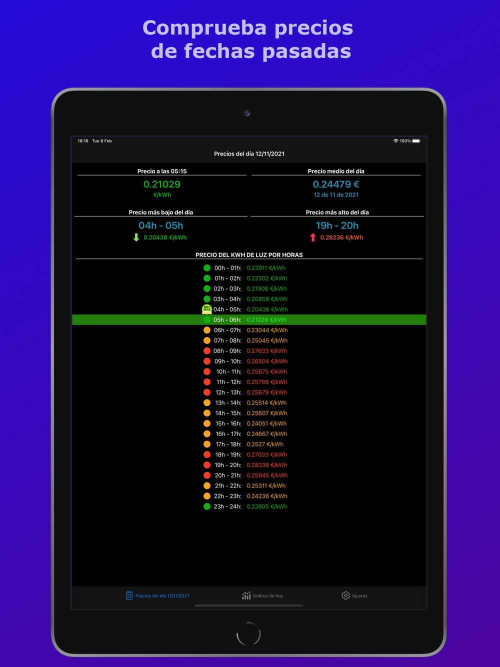 Consulta a diario los precios de la luz en €/kWh de forma sencilla y distinguiendo por horas cual son las mejores franjas horarias, cuales tienen un precio medio y cuales son las franjas horarias a evitar.