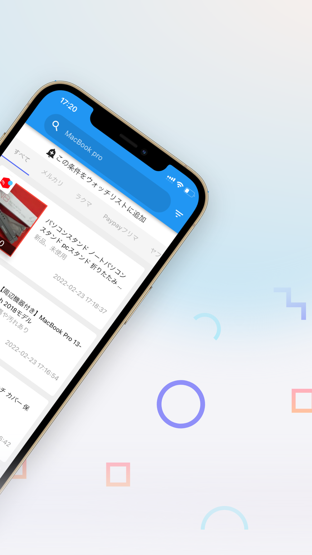 - メルカリ、ラクマ、Paypayフリマ、ヤフオク(フリマ)一括サーチできます。