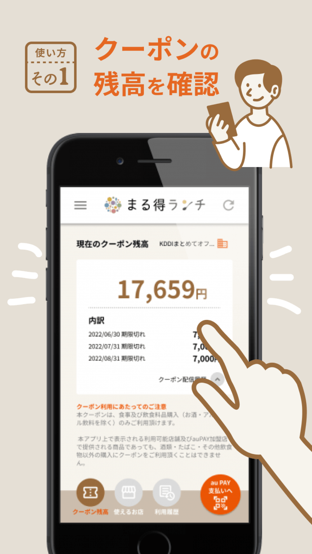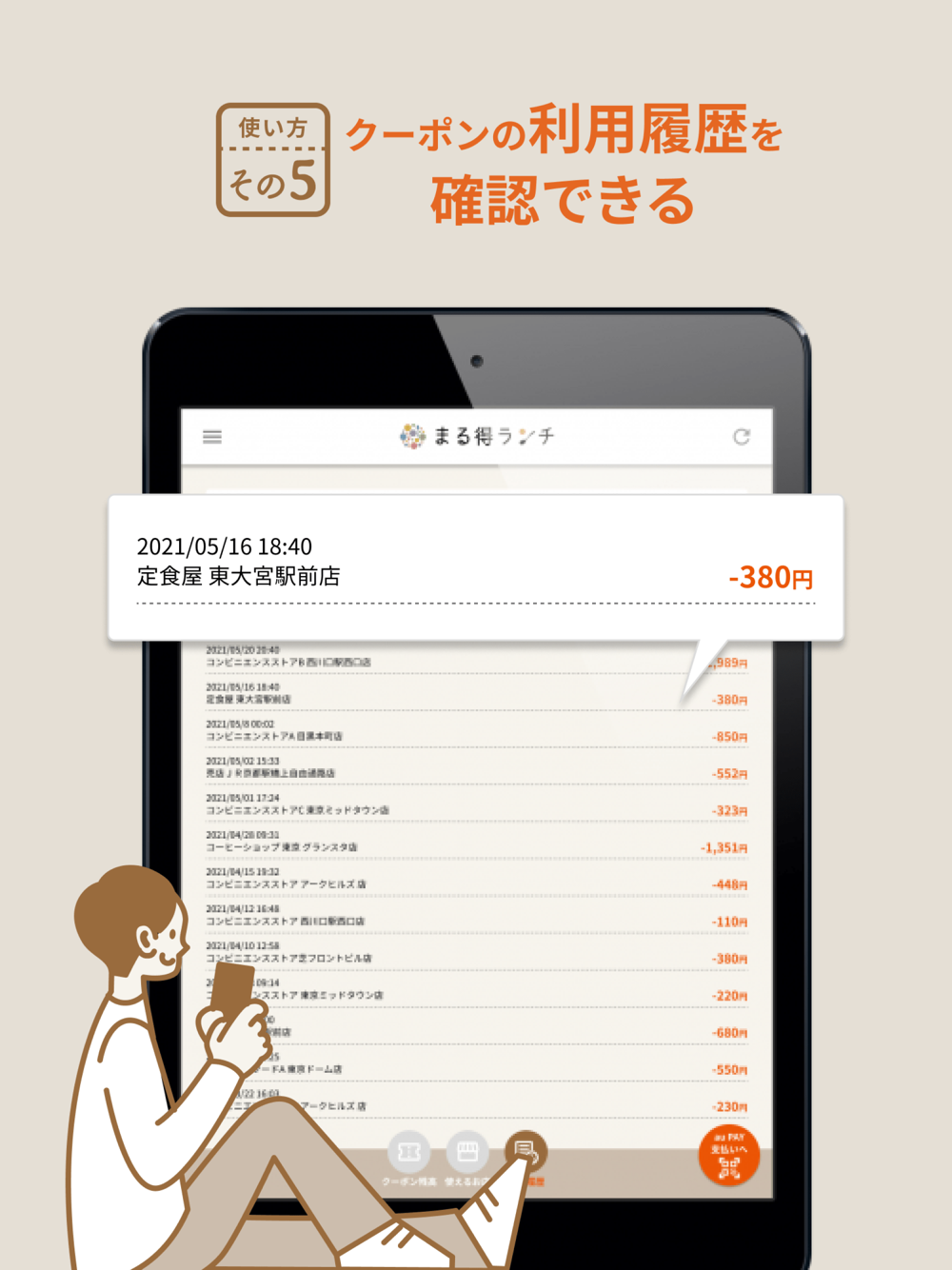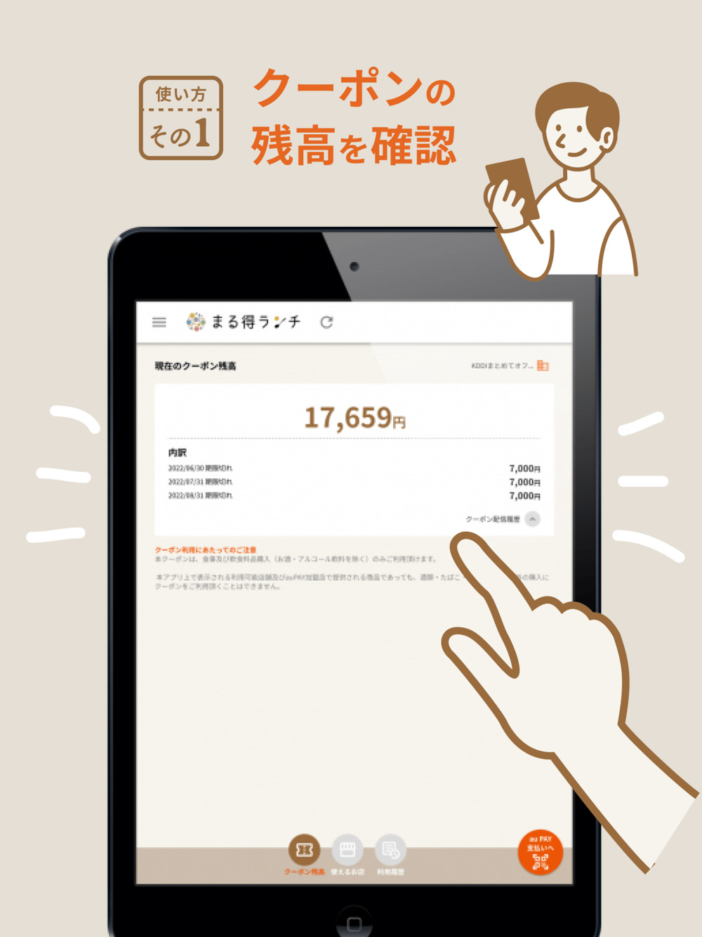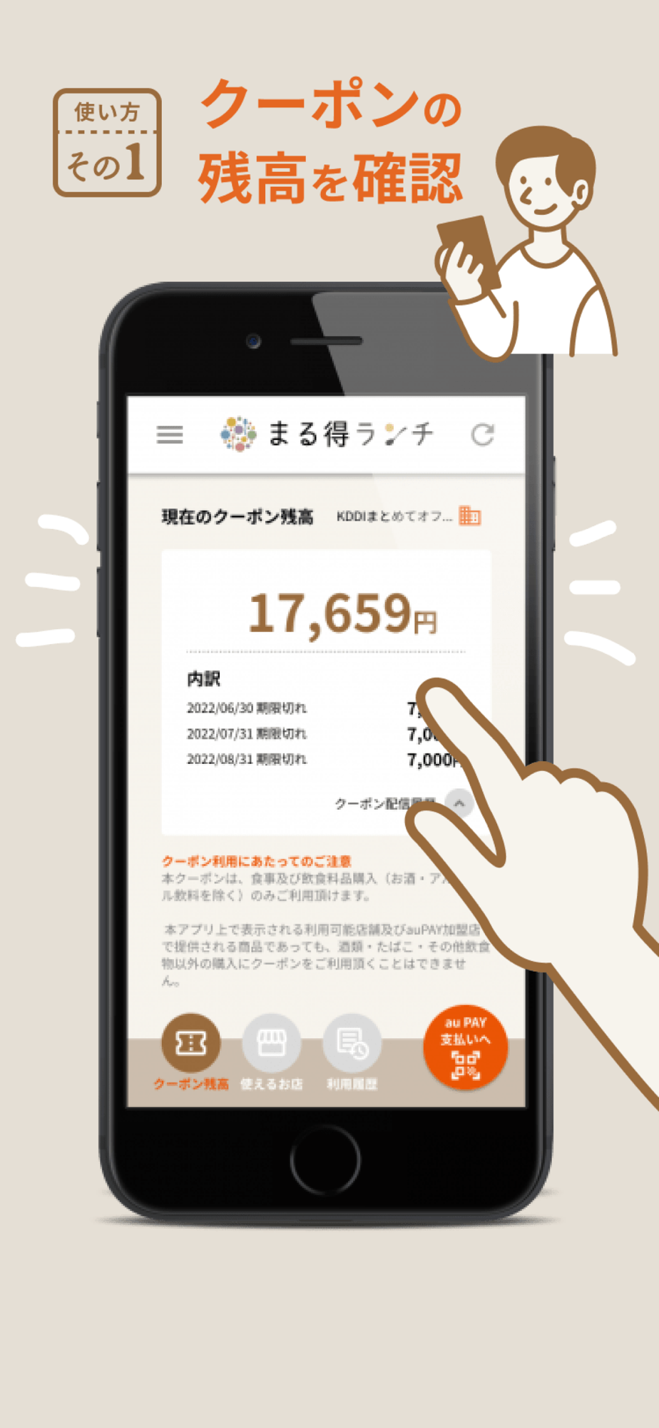 ご利用にあたって、まる得ランチアプリにて、クーポンの残高およびクーポン利用可能な店舗をご確認のうえ、ご利用ください。