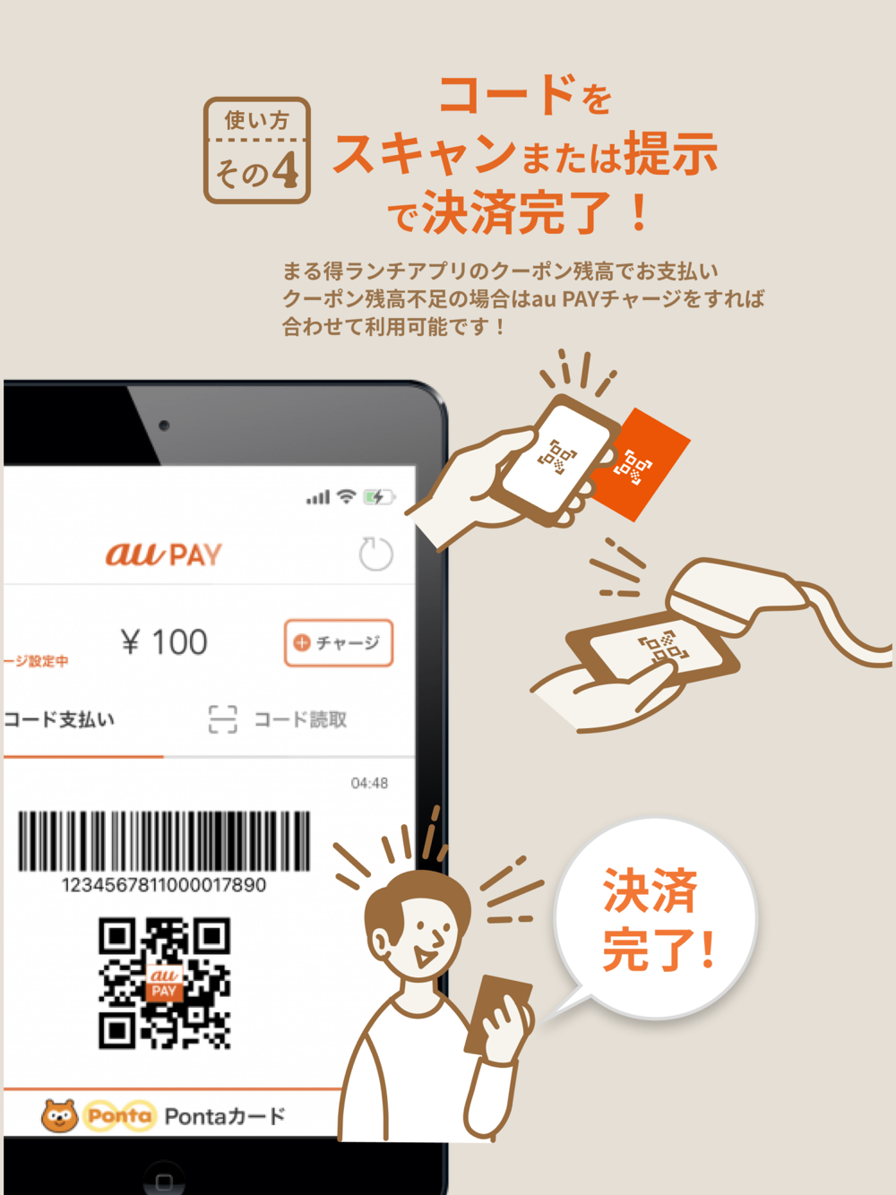 ワンクリックでau PAYアプリの決済バーコードを表示してそのコードを読み取る、もしくはお店で表示しているQRコードを読み取るだけでまる得ランチクーポンで決済をすることができます。