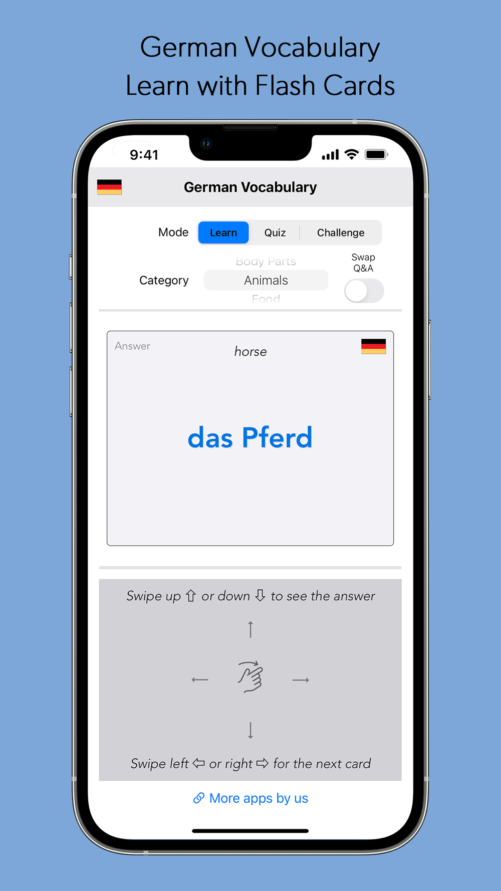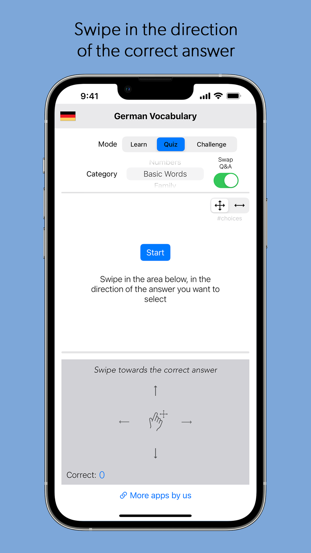 • 2 swipe modes: 4 answer choices or 2 answer choices (for Quiz & Challenge modes)