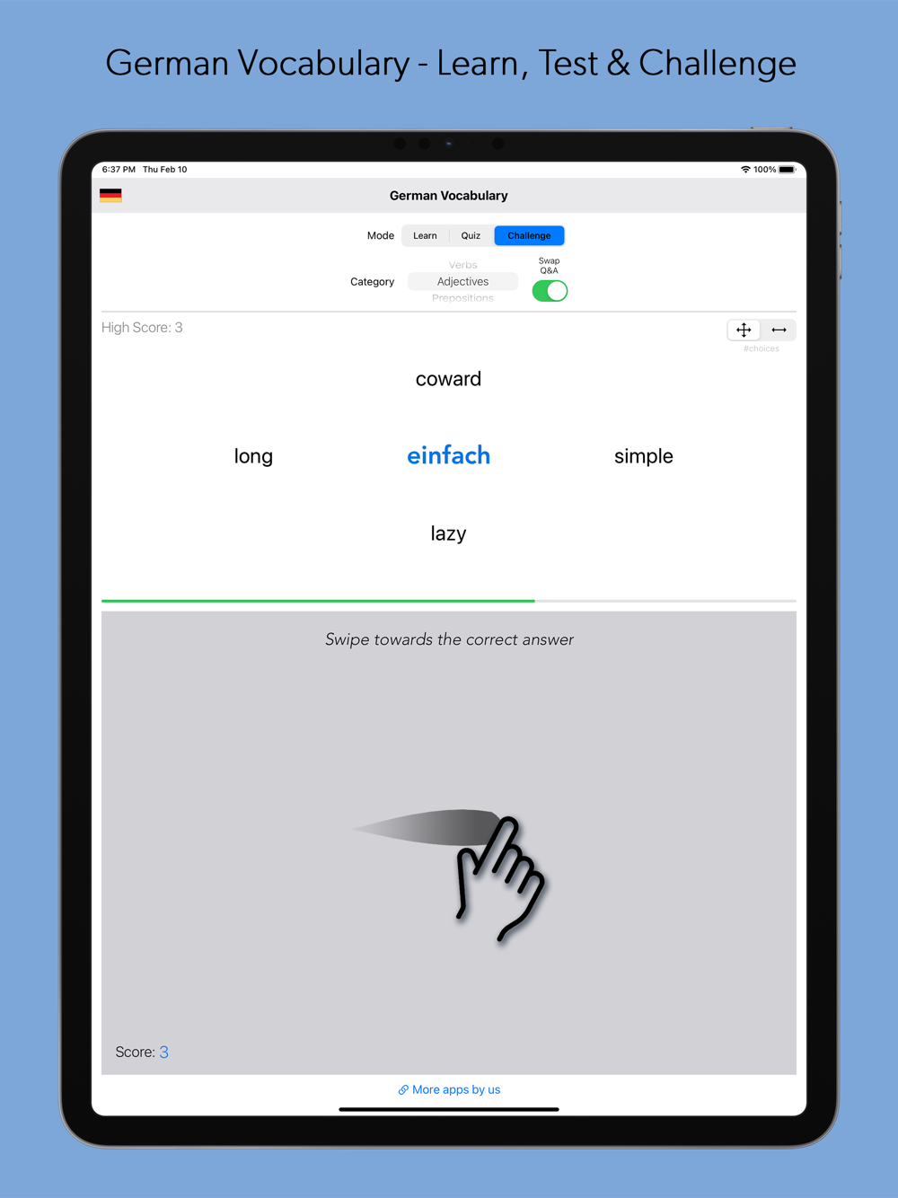 • High scores are maintained for each combination of category and swipe mode, in the Challenge mode