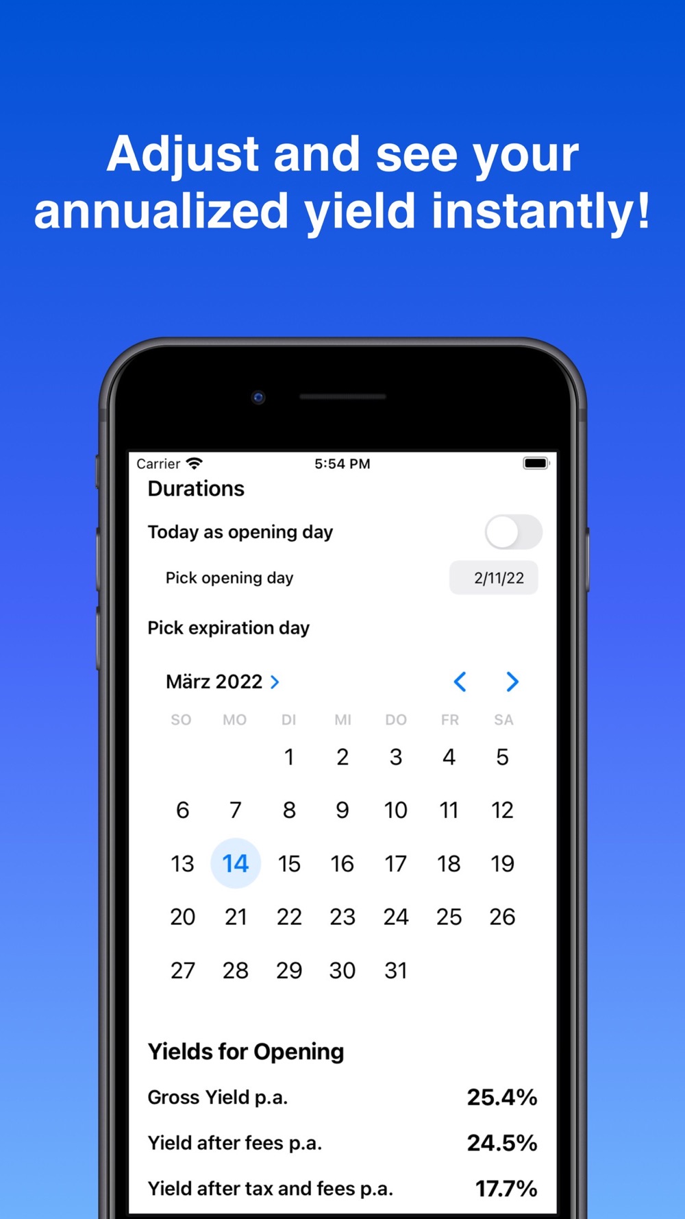 Especially when trading mobile, this App will enable you to improve and speed up your decision making significantly - by providing you with annualized yield figures in a snap.