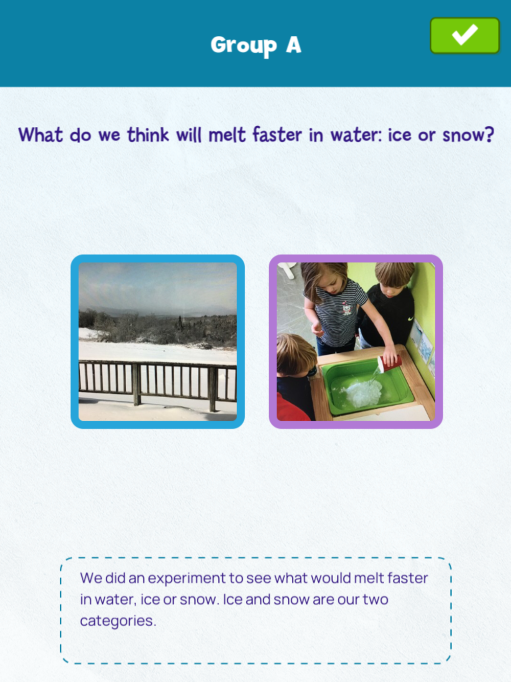 This app and its corresponding data collection and analysis investigations are designed to help preschool-aged children practice and learn early mathematics concepts, engage with meaningful questions about the world around them, and use active problem-solving to answer these questions. Specifically, children will:
