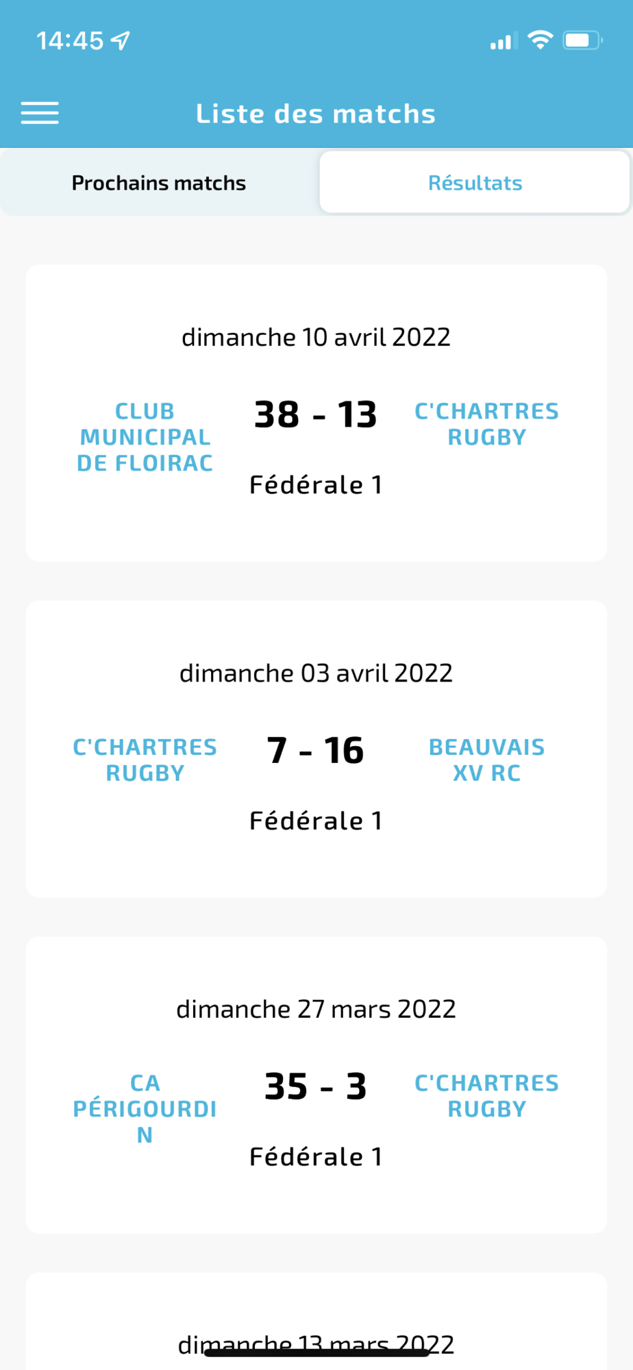 Cette application vous permet de consulter toutes les actualités du Club de Rugby de Chartres. Vous pouvez consulter les résultats, le calendrier des prochains match, découvrir l'équipe et voir l'ensemble des partenaires de l’équipe du CCR ou RCM. Un système de notifications vous permettra de ne rater aucune actualités du club !