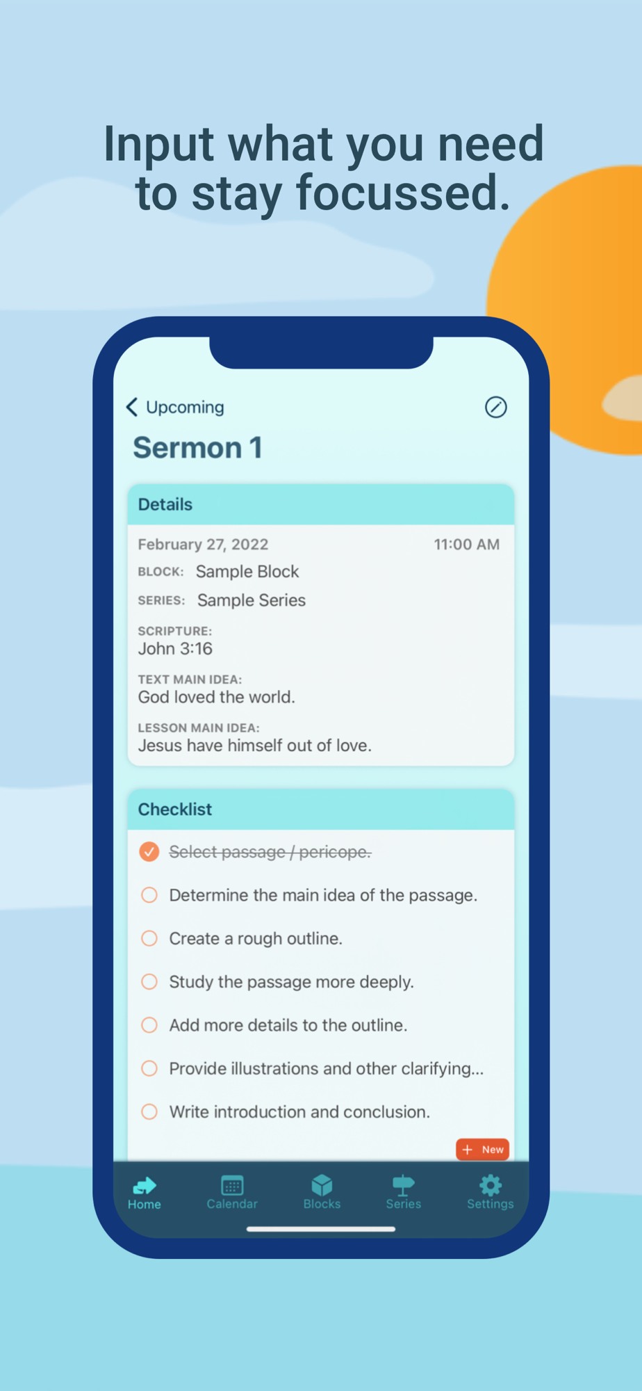 • Each lesson allows you to set most of the details you need to stay on track with preparation: scriptures, main ideas, teaching / sermon series, checklists, and notes.