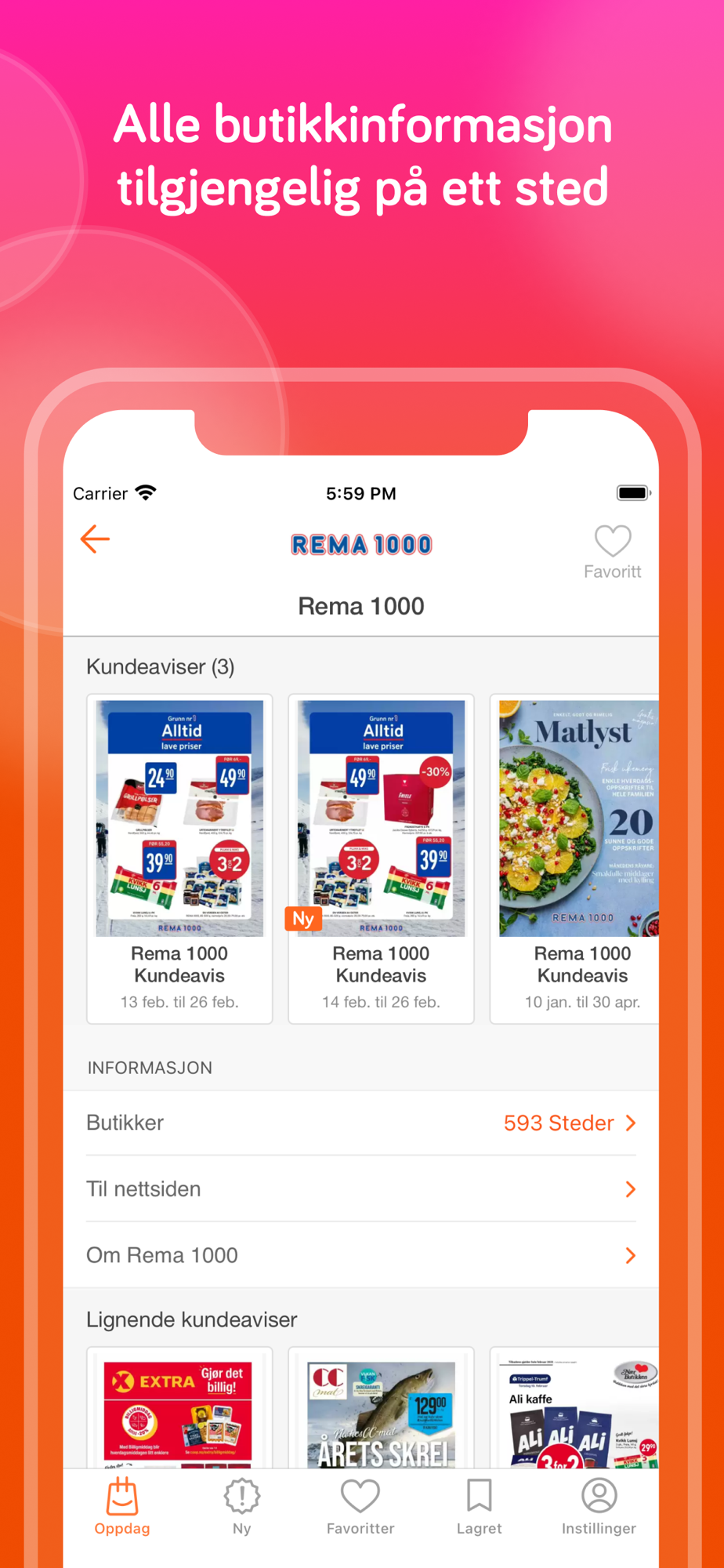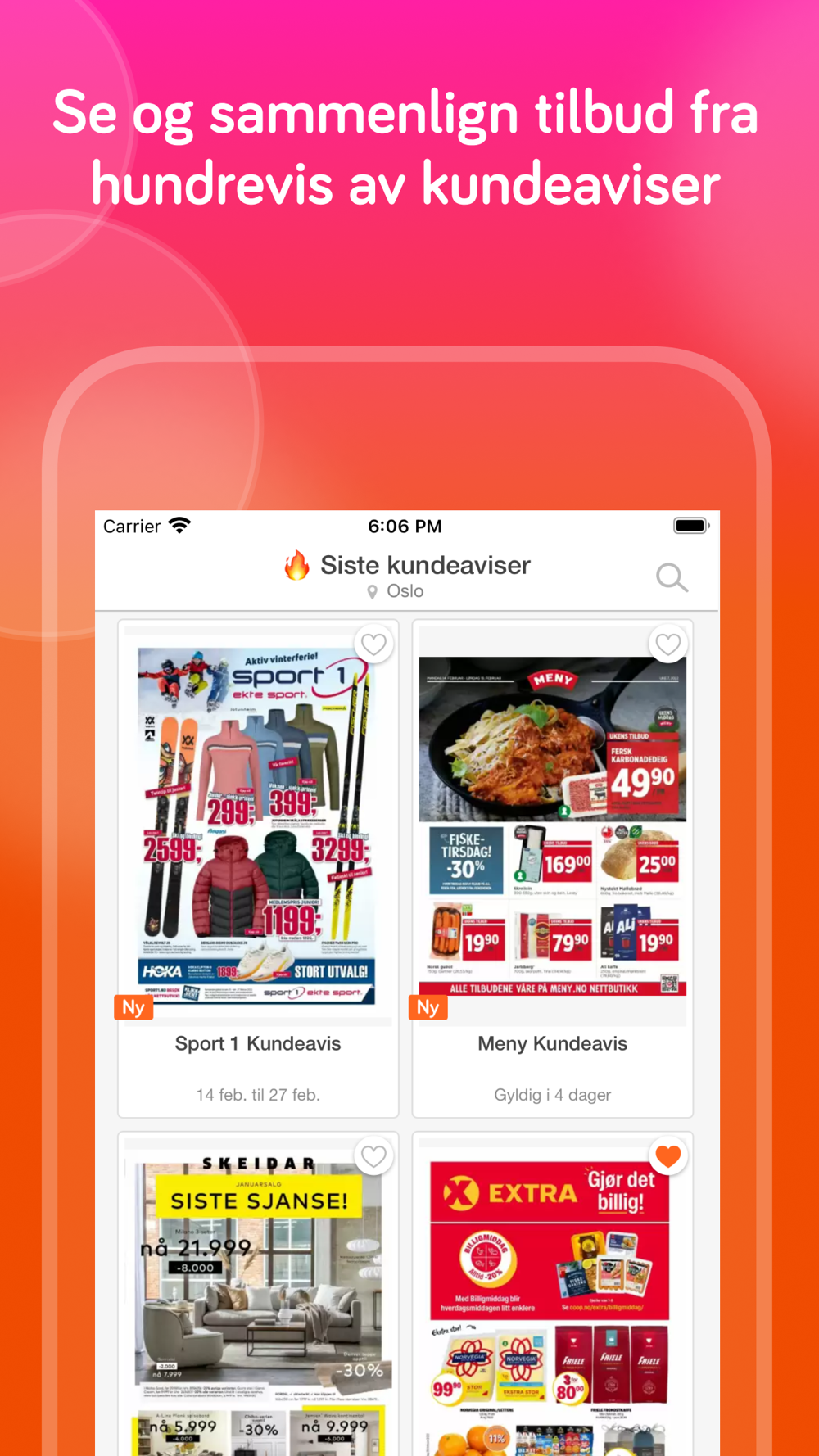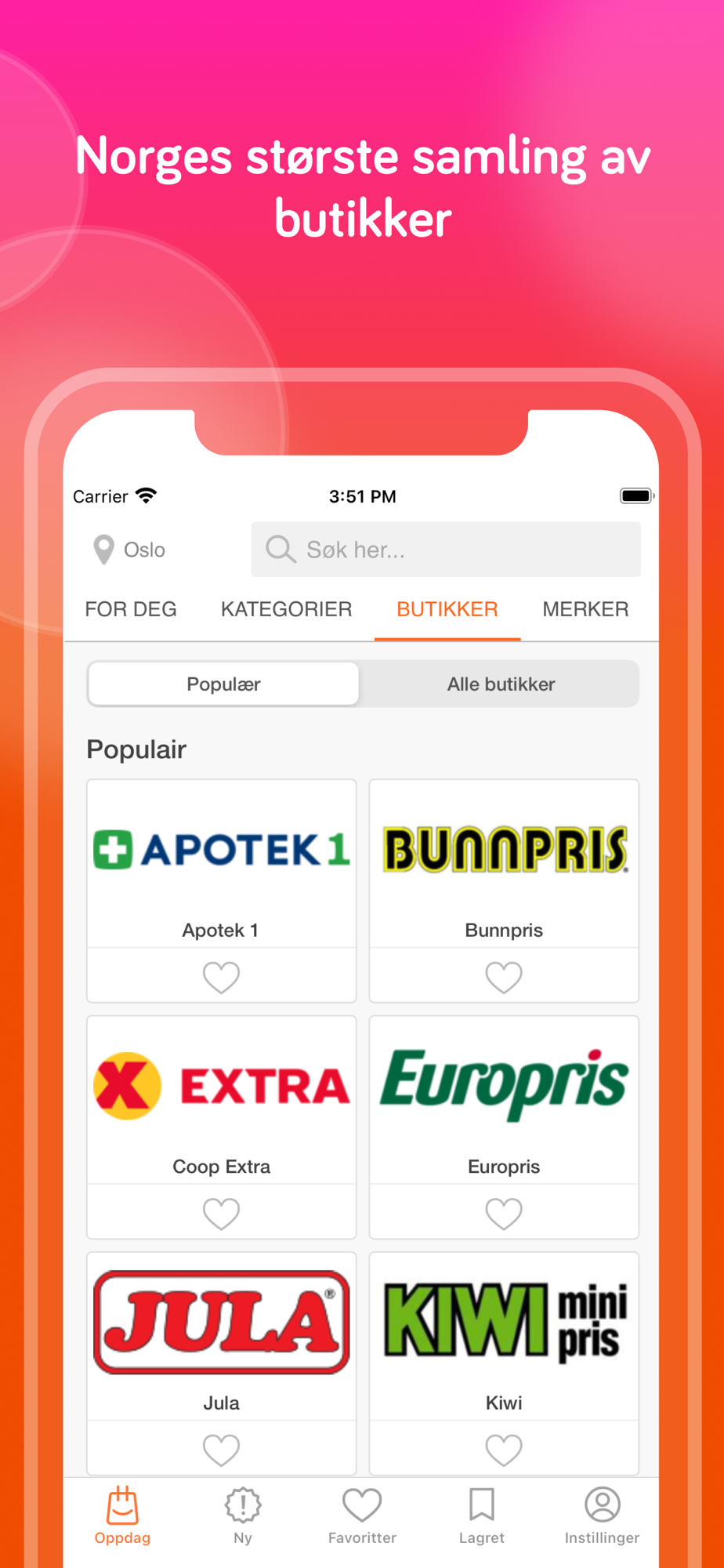 Vår app fra Kundeavisogtilbud.no viser deg alle gjeldende brosjyrer fra både store og små butikker i Norge. Ikke bare alle supermarkeder og byggevarebutikker, men også av el-butikker, motebutikker, leketøysbutikker, databutikker, apotek og mye mer. Vi har til og med listet opp de fleste lokale butikkene for deg! Hvis du vil lagre en spesifikk butikk som ditt favoritt, klikker du bare på hjertet for å legge den til din personlige liste. På denne måten vil du alltid være den første som får vite om tilbud fra favorittbutikkene dine og samtidig samle kundeavisene som du er interessert i.