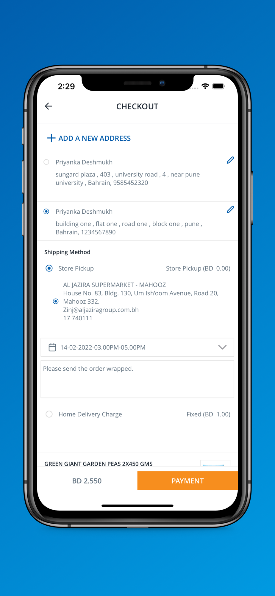 You can book a free home delivery slot by placing a Minimum order of BD 7 or avail of our Click & Collect slot free of charge.