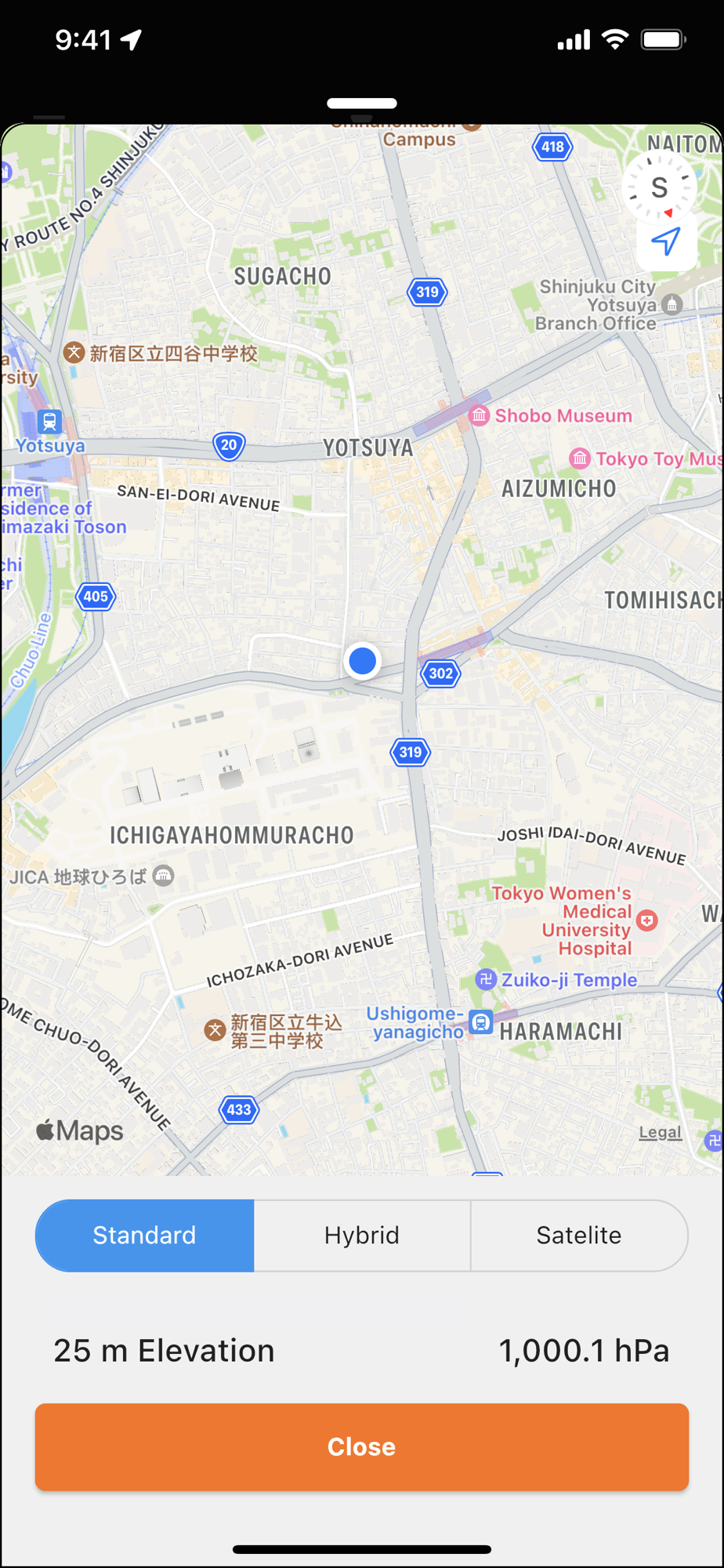 Check your current latitude and longitude on a map. Additionally, altitude and atmospheric pressure are displayed.