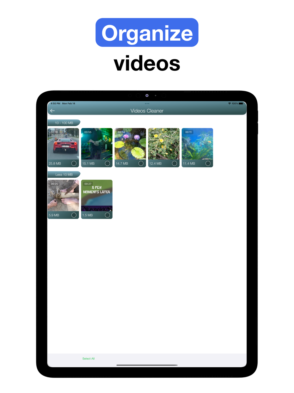- Videos Cleaner: Organize videos by the rule ordering more convenient management. Quickly delete large videos.
