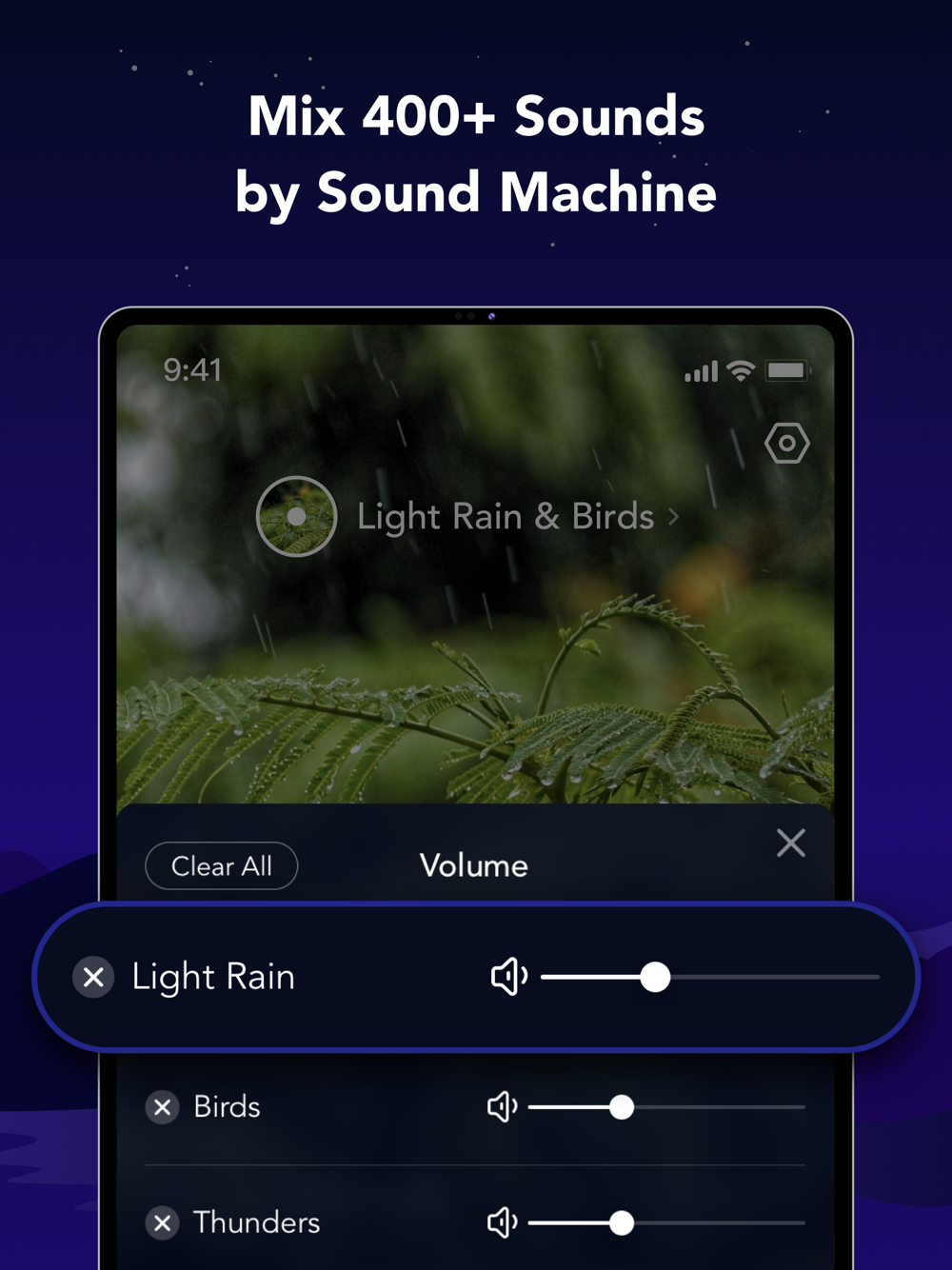- 50+ perfectly looped sounds: rain sounds, bedtime fan noise, airplane cabin...