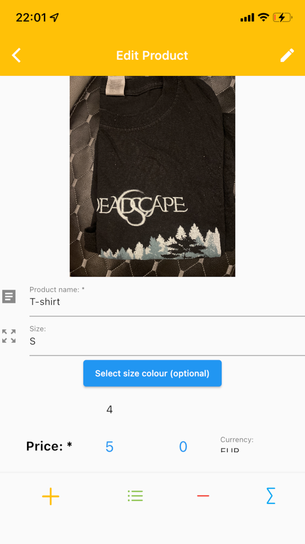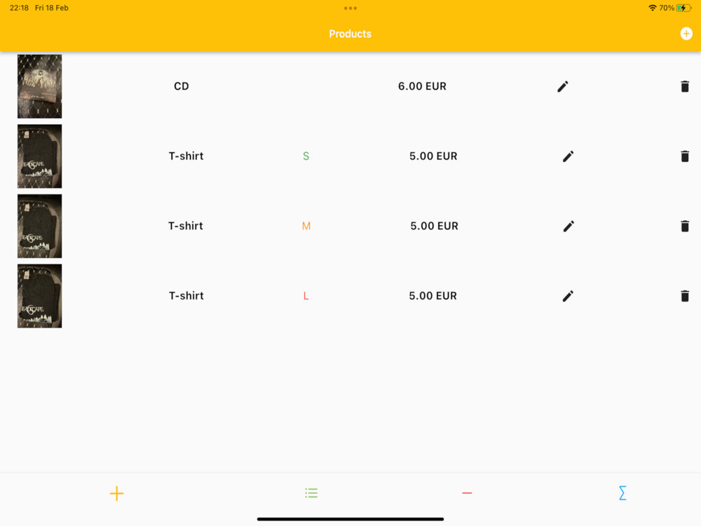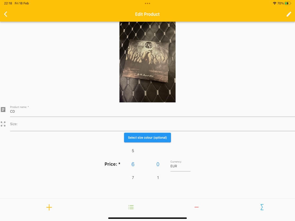 Add, edit or delete products from the products screen. You can optionally add currency, size and a display colour for the size text. Mandatorily you need to supply name, price and a picture.