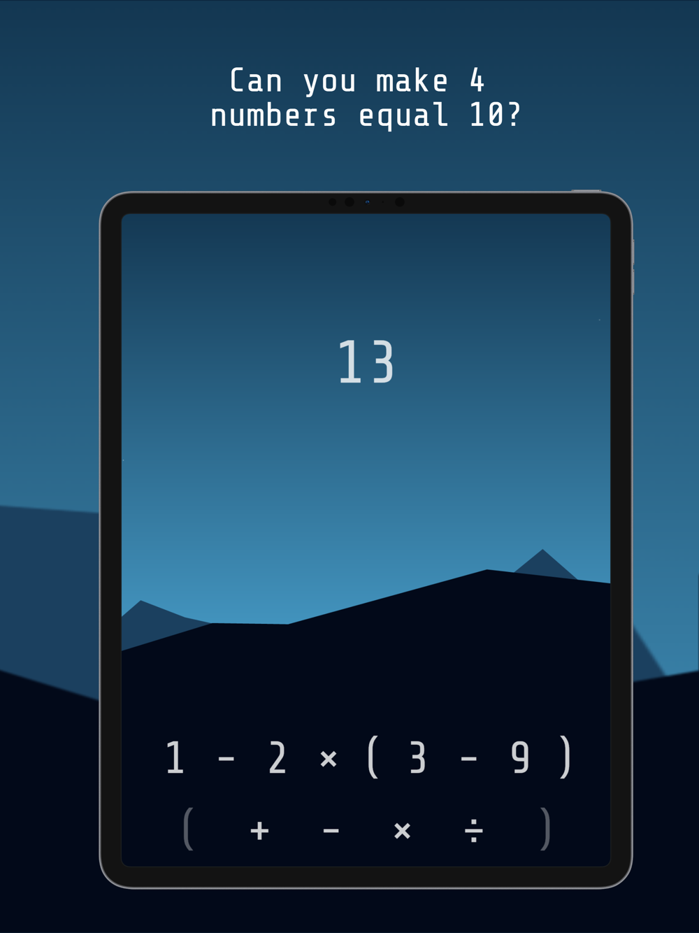 4=10 is a simple number puzzle game suitable for all ages. The objective is to use four given numbers and combine them in an expression that equals 10. For example, you can solve it by adding 1, 2, 3, and 4 together (1+2+3+4=10).