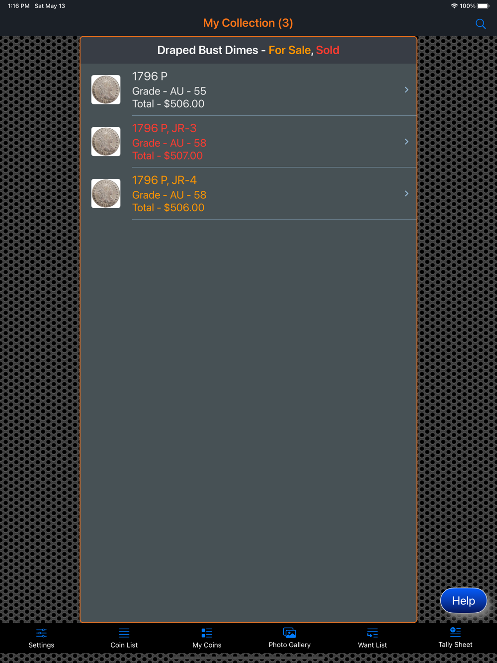 This app will provide the ability for the user to organize, track and manage their collection of coins. Images of each coin can be included with the collection. There is also a means within the app for the user to peruse all of the images in an entertaining manner. The app has three (3) color themes which help to make the app more enjoyable. A running tally of the cost for the entire collection is provided. A want list is also included in the app to allow you to ear-mark coins that you are searching for.