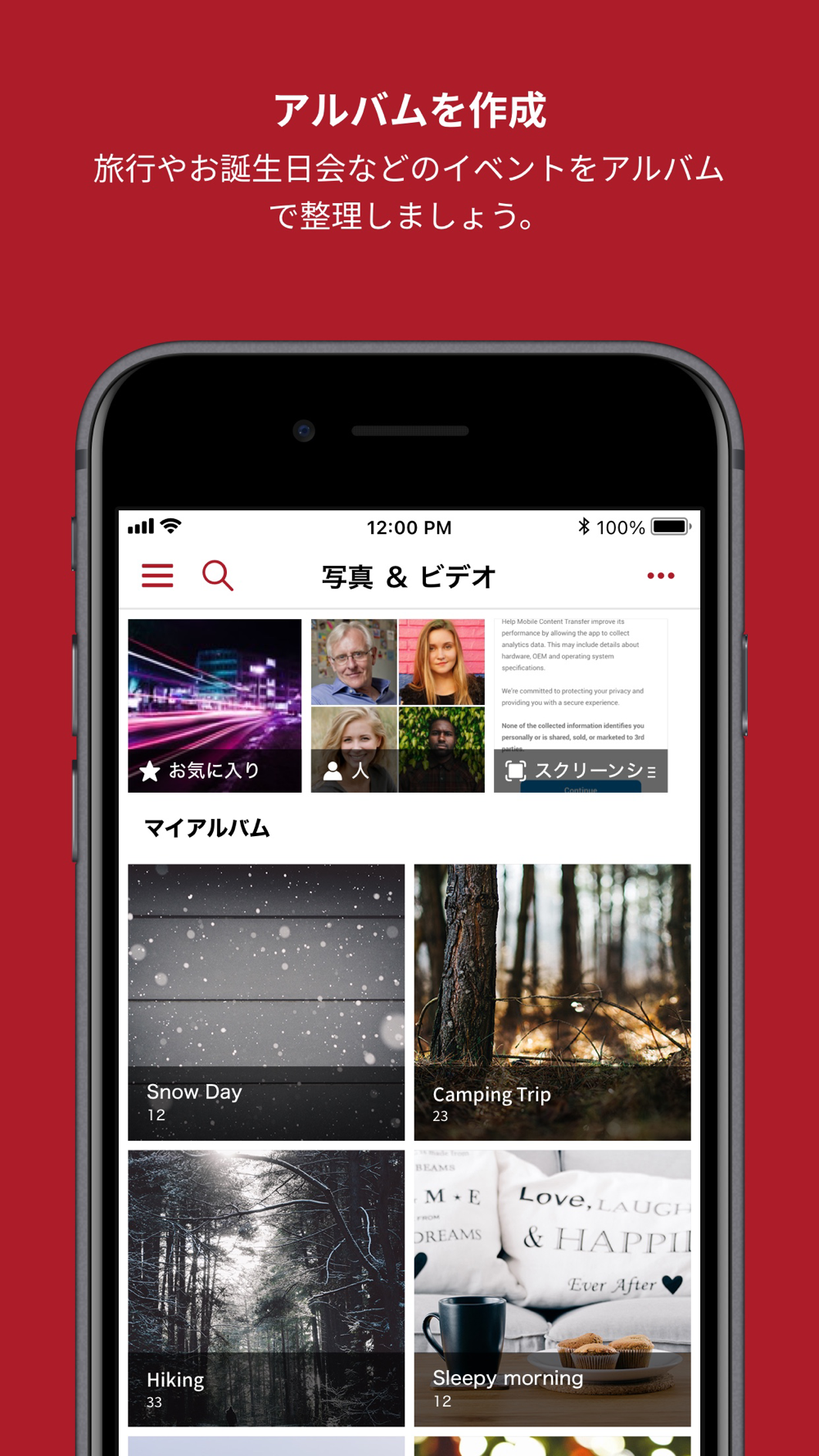・アルバム機能を活用することで、誕生日や旅行などのイベント毎にアルバムを作成してデータの整理をすることが可能です。