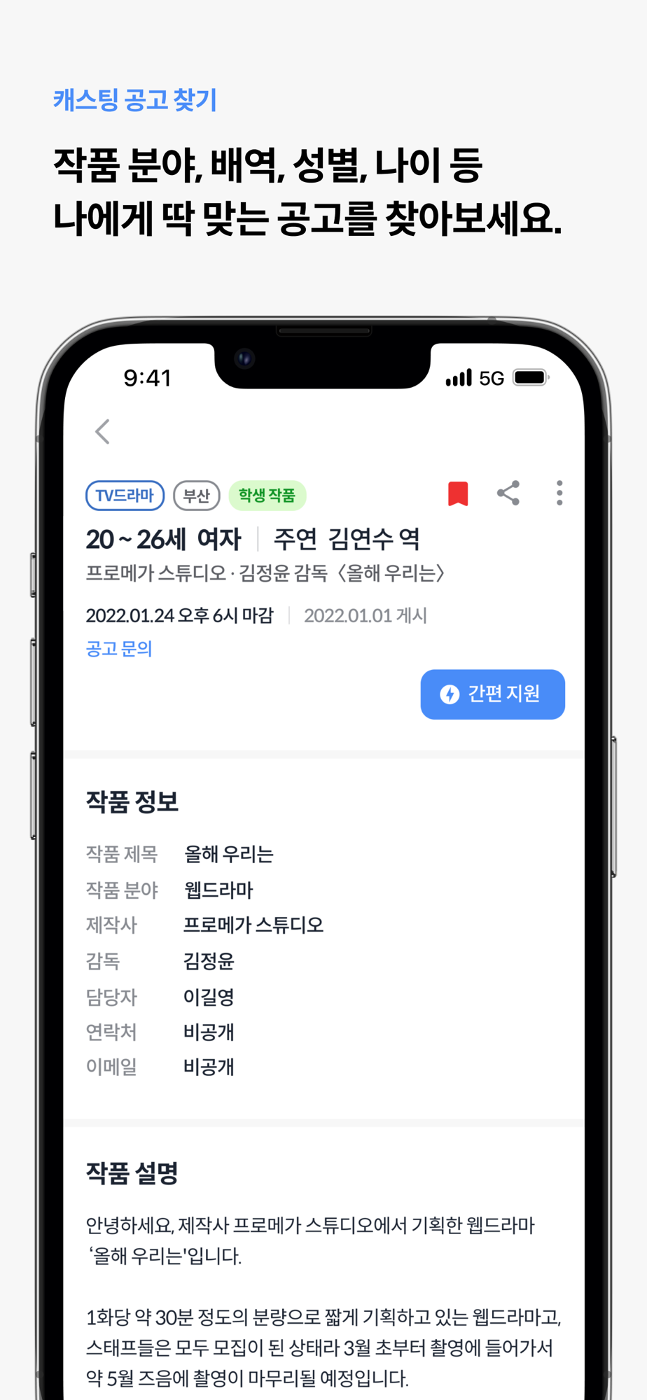 내 포트폴리오만 있다면 캐스팅커넥트의 모든 공고에 클릭 한 번으로 간편 지원할 수 있어요!