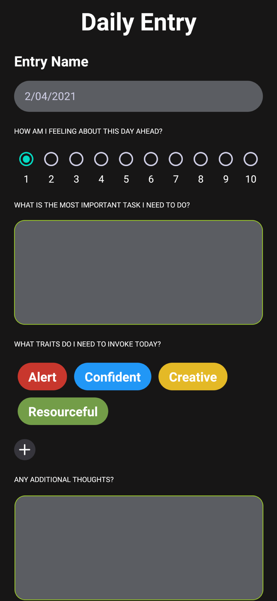The app has a daily journal with questions designed to keep you focused on your day ahead, help you collect your thoughts, and reduce stress.