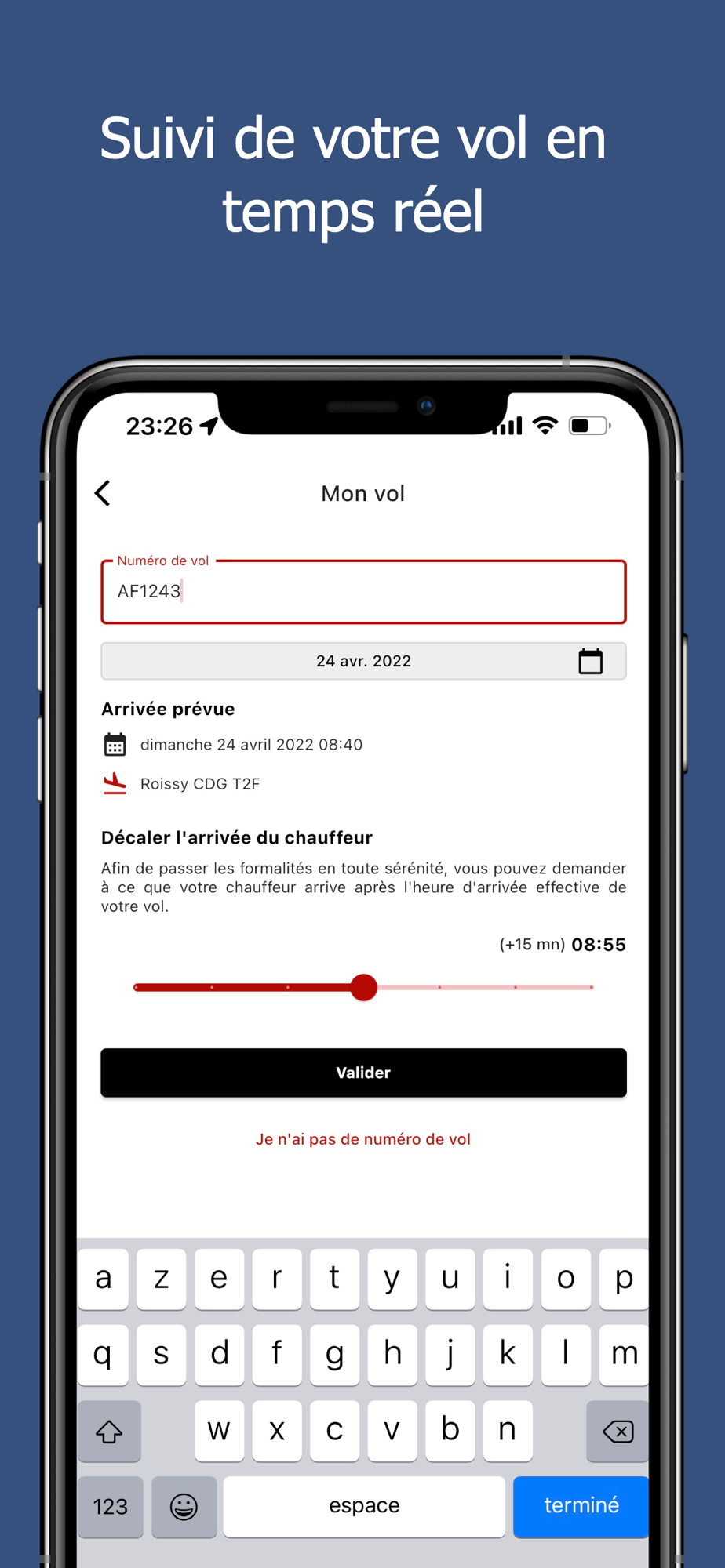Indiquez votre numéro de vol, l’heure de votre réservation est ajustée automatiquement selon l'avance ou le retard de votre avion.