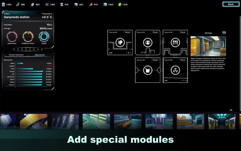 Develop your orbital habitat, enhancing it with additional modules for various purposes. Monitor the needs of the population, extract resources and distribute them fairly. Over time, your initial bunch of outcasts can turn into a proud self-sustaining space nation!
