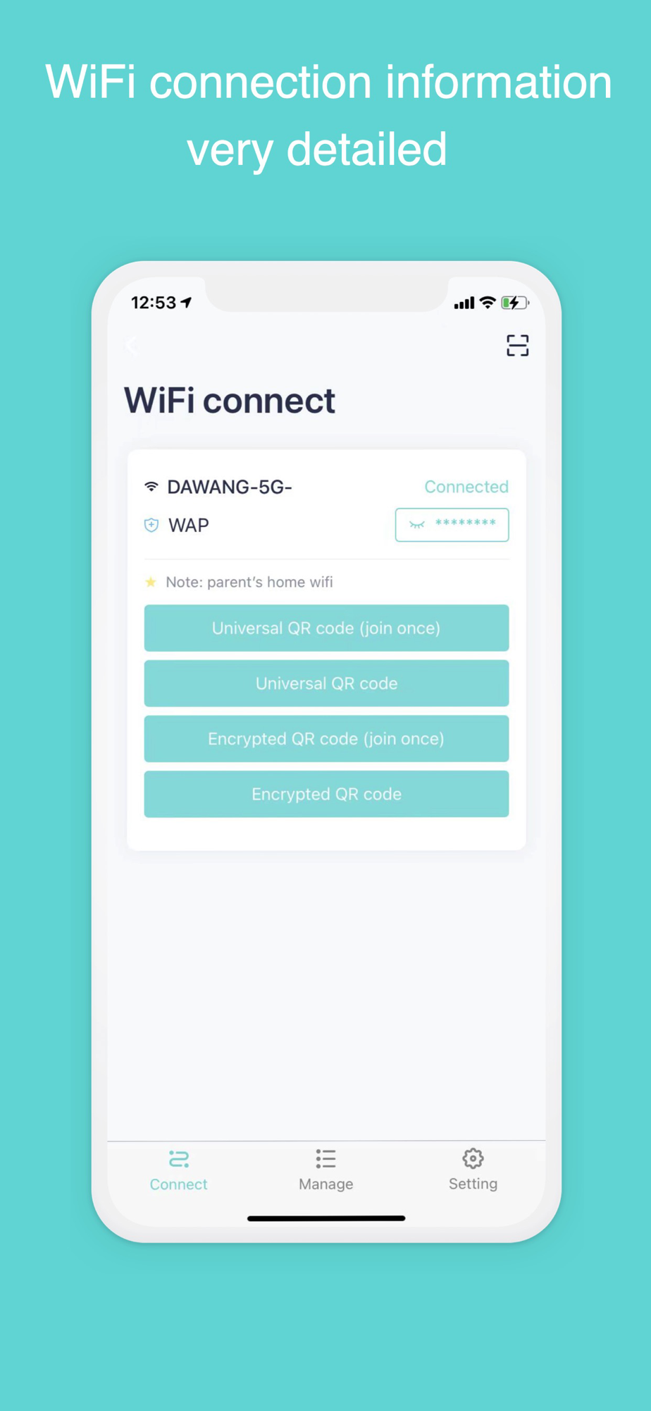 This application provides a variety of QR code types, universal QR code, encrypted QR code, to ensure the information security of WiFi. If you use \"join once\" to connect to WiFi, the user's system will not retain WiFi information, and the next time the user is under the coverage of this WiFi, it will not automatically connect to this WiFi, preventing the automatic connection to WiFi and the exposure of private travel information.