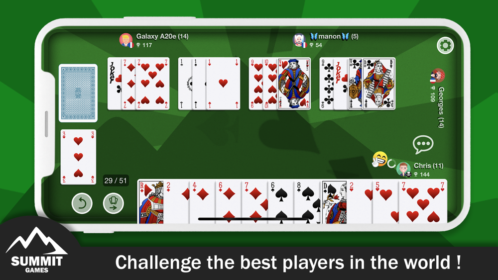 Play Rummy game wherever you are with Rummy online. Play alone against players controlled by a high level artificial intelligence with a realistic behavior, or compare yourself with other players from around the world.