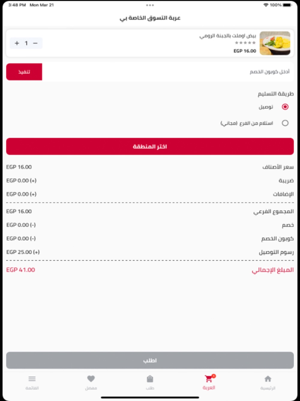 اختيار طريقة استلام الطلب ” تيك اواي – في المنزل”