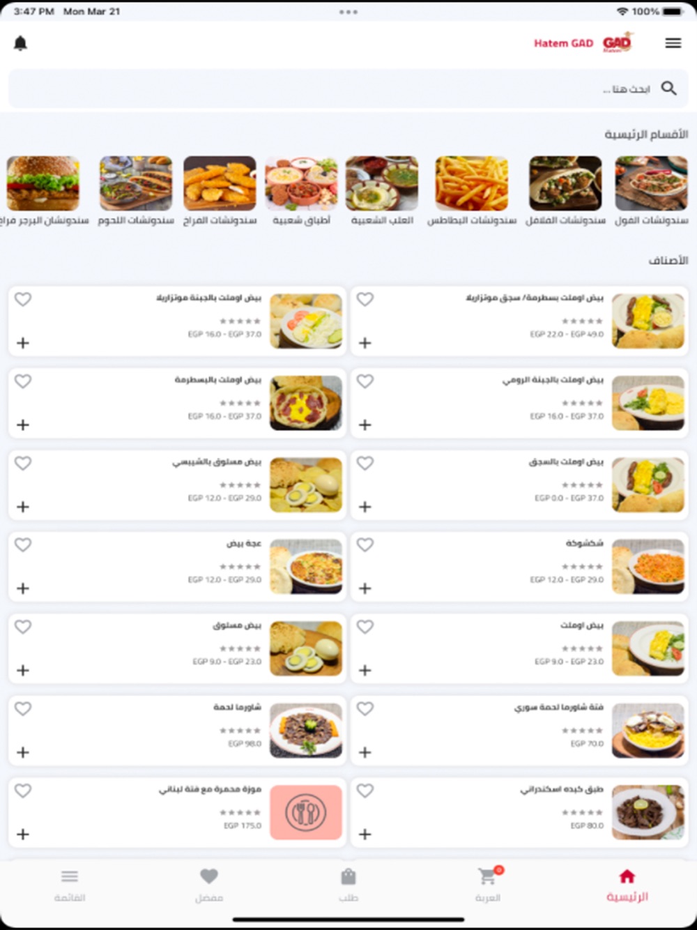 واجهة سهلة الاستخدام لاختيار الاقسام والطلبات والعدد والحجم و الاضافات
