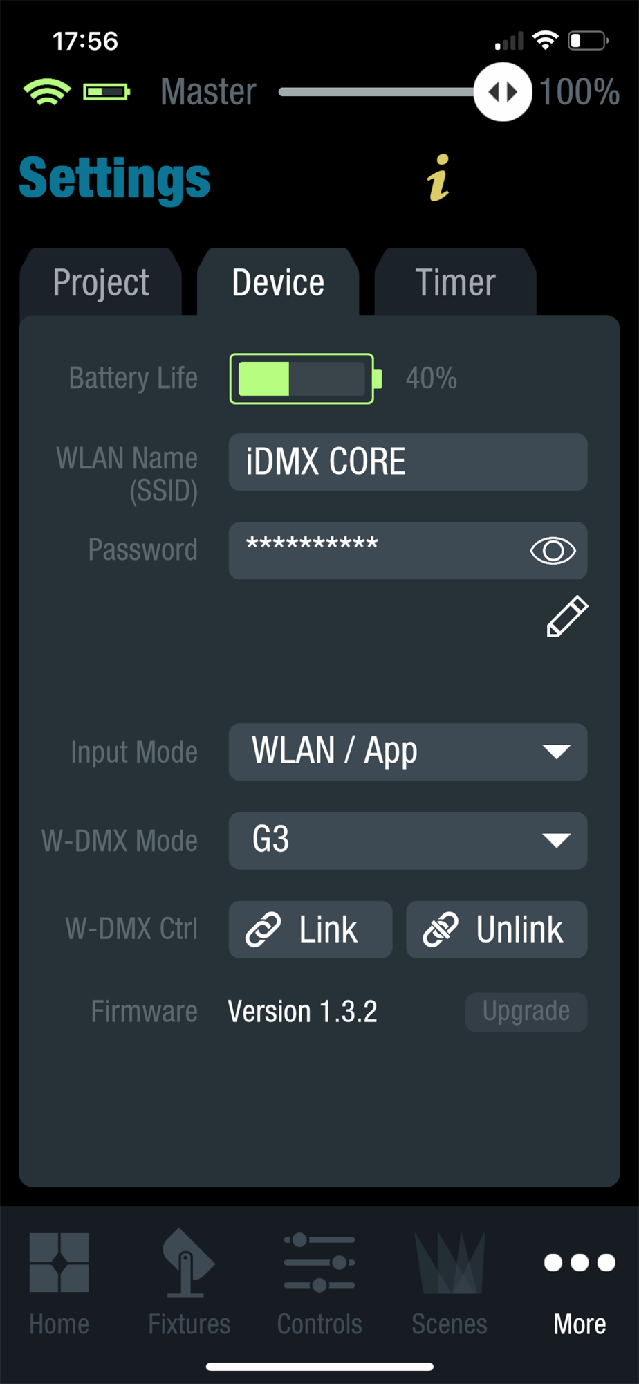 The iDMX® APP requires Cameo’s iDMX® CORE interface. This battery powered WiFi receiver integrates a 2.4 GHz W-DMX™ transmitter with up to 300 m operating range. It allows you to control both standard DMX and W-DMX™ enabled fixtures with the app.