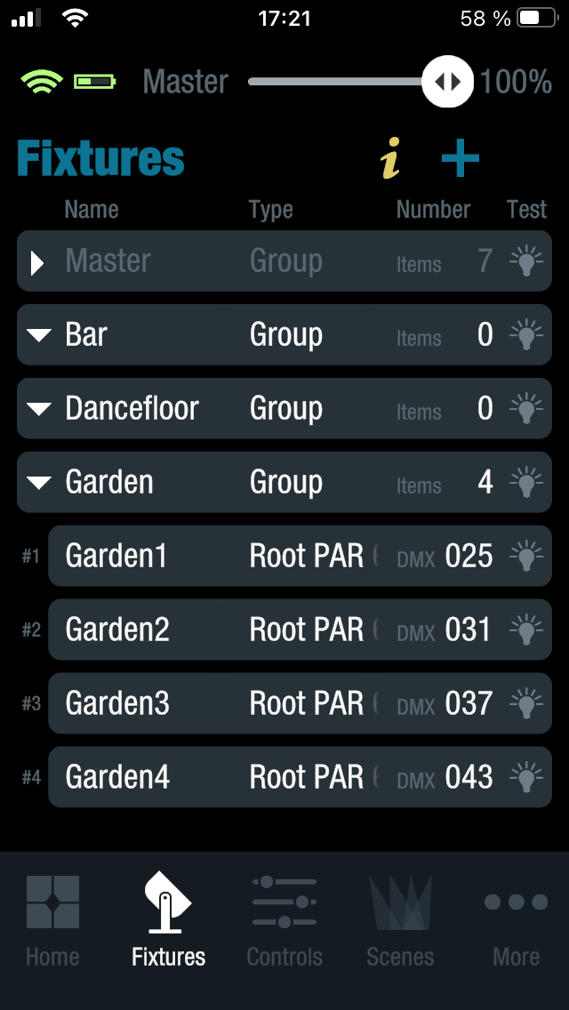 Arrange fixtures in groups, create custom colours, generate effects and activate up to eight of them in parallel. The Cameo iDMX® APP supports a full DMX universe of 512 channels and all RGB, RGBA, RGBW, RGBWA, RGB+UV and RGBWA+UV lightsfixtures. It includes a timer to start and stop your lighting performance automatically.
