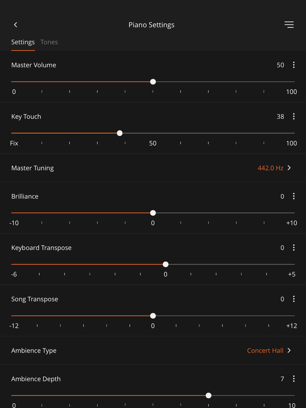 • Control piano functions such as transpose, split, key touch, ambience, and more
