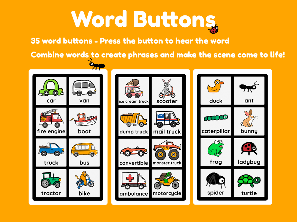 Combine words to create 2 and 3 word phrases and make the scenes come to life with cars and bugs! Explore 35 word buttons about cars, bugs, and opposites. Great for speech therapy, early talkers and readers.