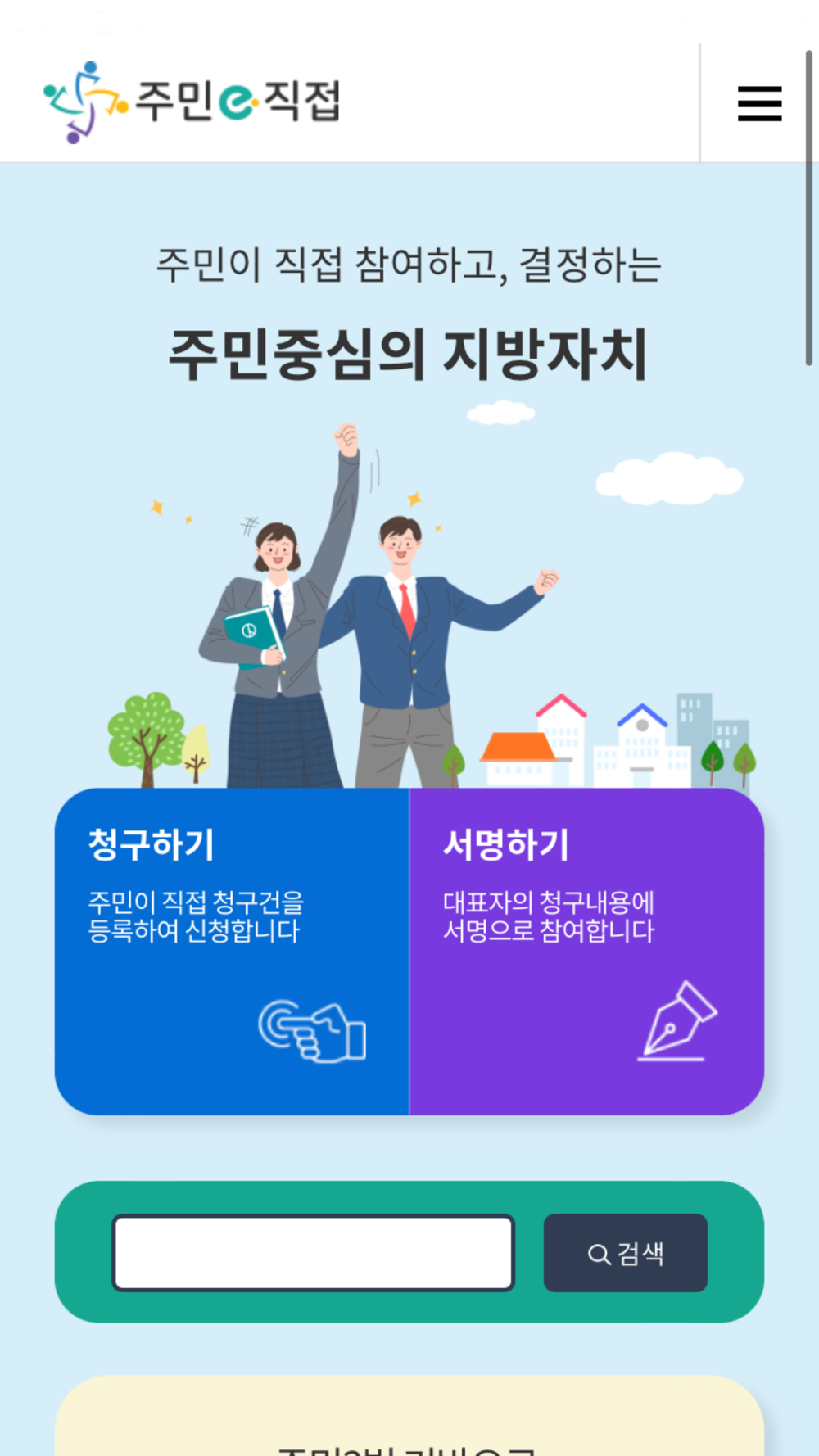 주민e직접 플랫폼(www.juminegov.go.kr)은 주민이 지역 현안에 직접 주민조례 발안, 주민투표 및 주민소환투표를 청구하고, 서명할 수 있는 비대면 온라인 서비스입니다.