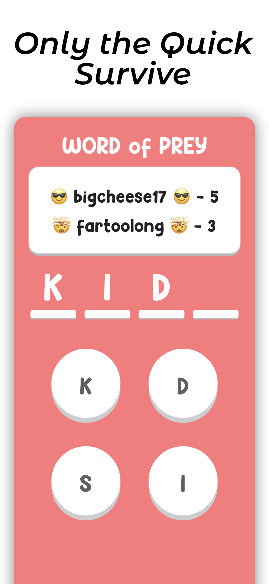 Word of Prey is a game featuring head to head match-ups where you race against your opponent for every word. Speed is the name of the game; once you get a word right it switches to the next word for you and your opponent. Compete for every word to come out on top!