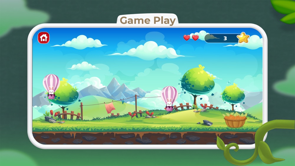 At the top of the screen there are hot air balloons carrying flying rabbits. The balloons ran out of fuel and crashed to the ground. On the right side of the screen there is a basket of carrots, your task is to touch and drag the carrots towards the balloon so that the balloon continues to fly. Do not let the balloon fly to the edge of the screen or touch the ground, every time the gyro touches the balloon, it will be pushed by 1 more force (physical) and then fall again. Let 3 hot air balloons touch the ground => lose