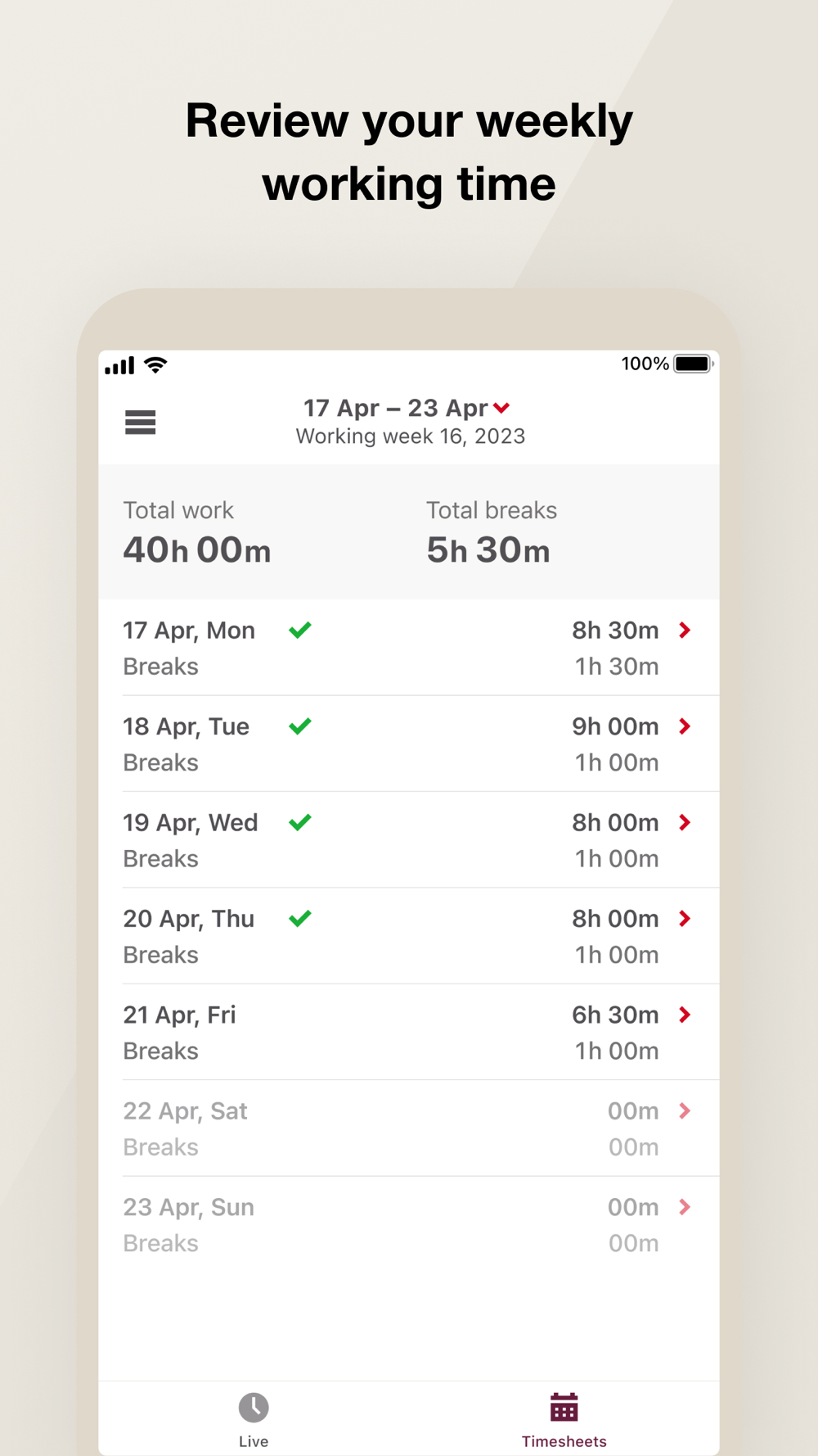 * Review working hours and rest time in neatly organized timesheets