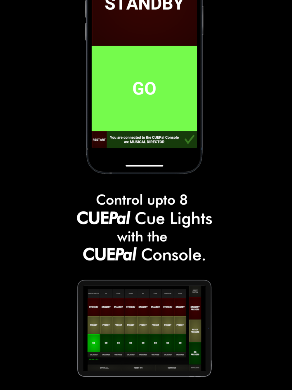 The CUEPal is a cross-platform cue light system for use over a WiFi network. CUEPal Cue light is a simple cue light app that can be used in conjunction with CUEPal Console. With automatic connectivity and an intuitive interface, CUEPal is a great stage management tool for all live shows.