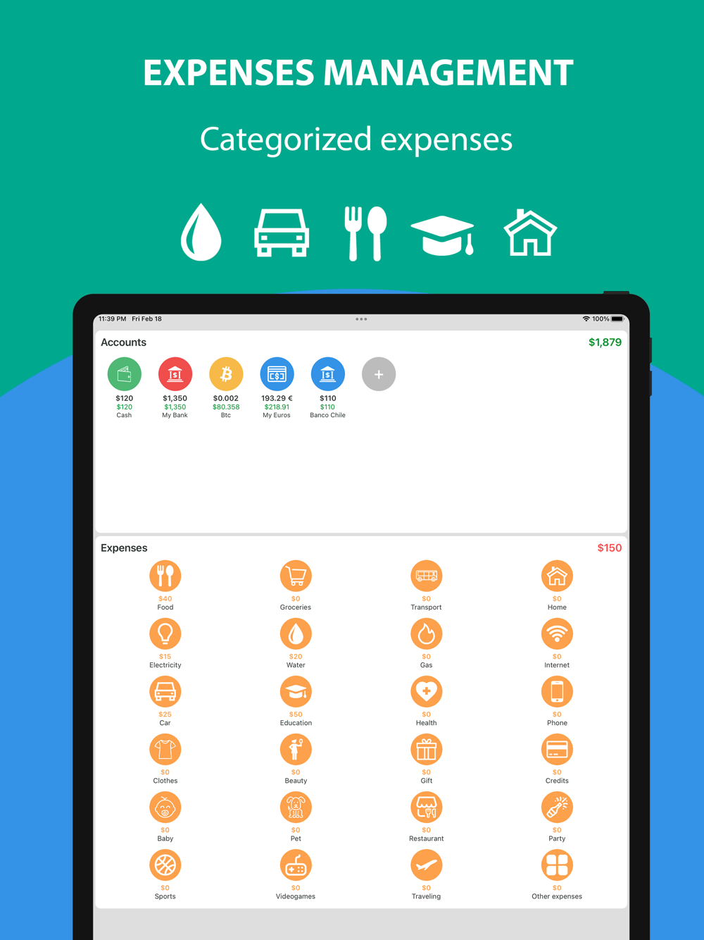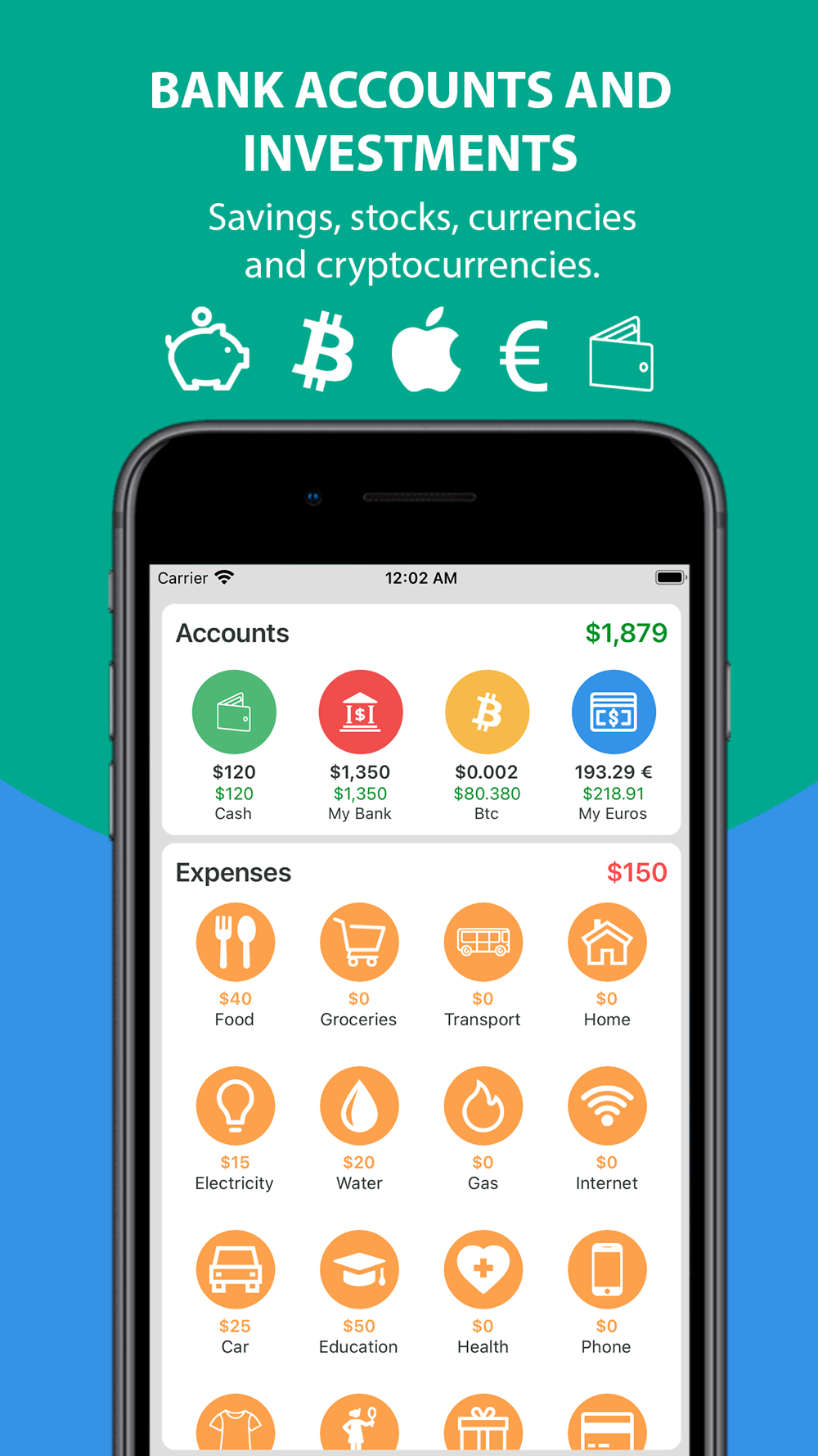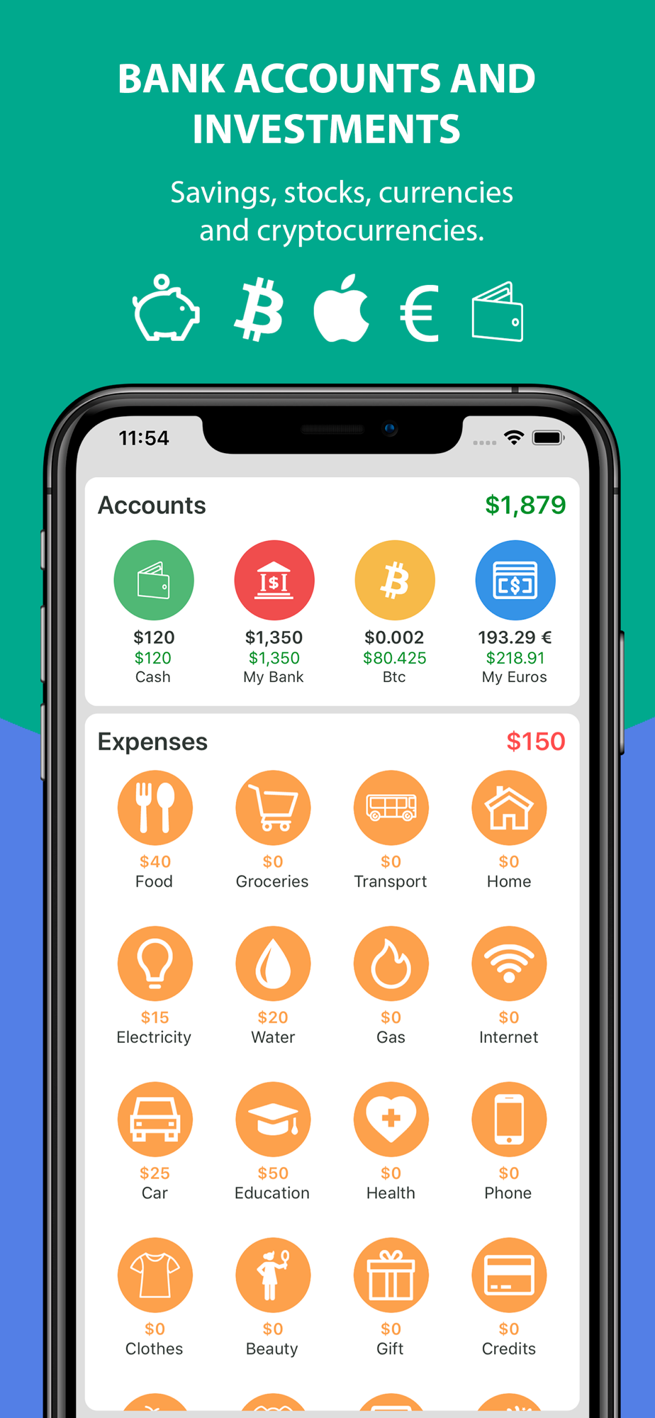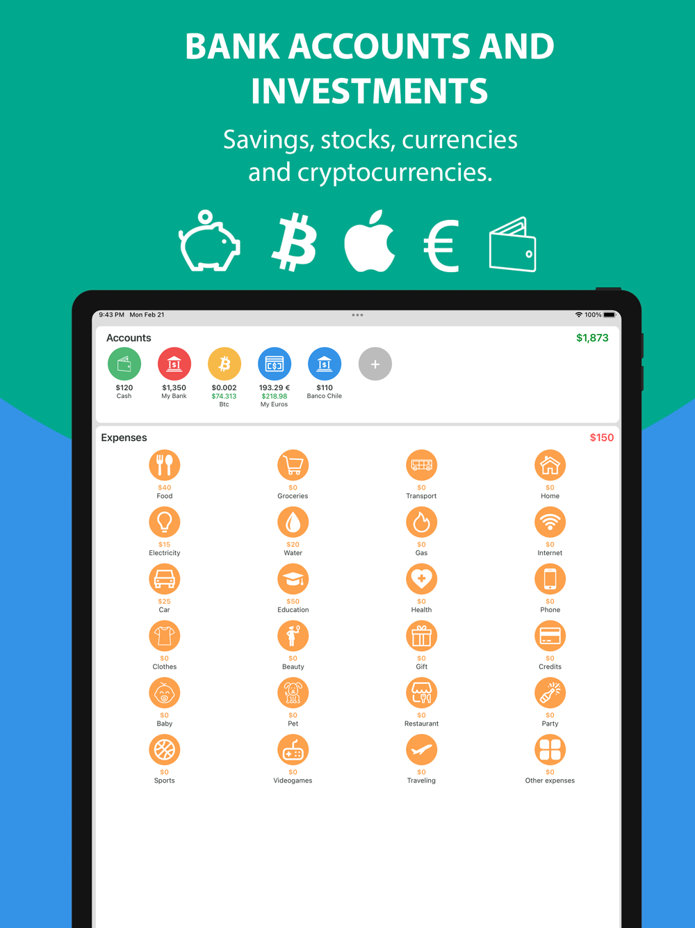 Management of expenses, incomes, accounts, savings and investments (stocks, currencies and cryptocurrencies).
