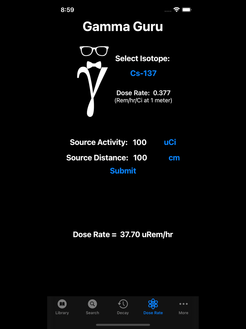 Gamma Guru provides fast, convenient access to a library of over 400 radioisotopes. Simply select an isotope of interest from the Isotope Library to view the associated gamma-rays and branching ratios and other information. Alternatively, enter up to three gamma-ray energies to see a list of isotopes that emit those gammas. Gamma Guru also includes radioactive decay and dose rate calculators.