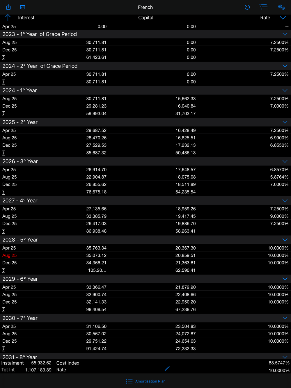 - vary: grace period, duration, rate, capital, installment, periodicity using French, Italian or German formulas.
