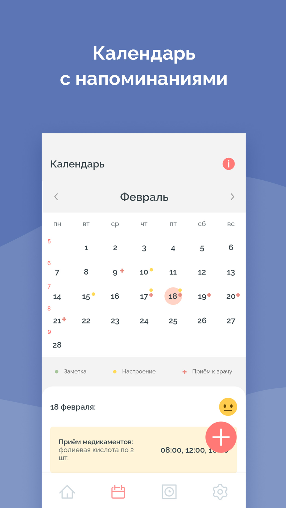 - Дневник беременности с возможностью: указать настроение, написать заметку, поставить напоминание о враче или приёме таблеток;