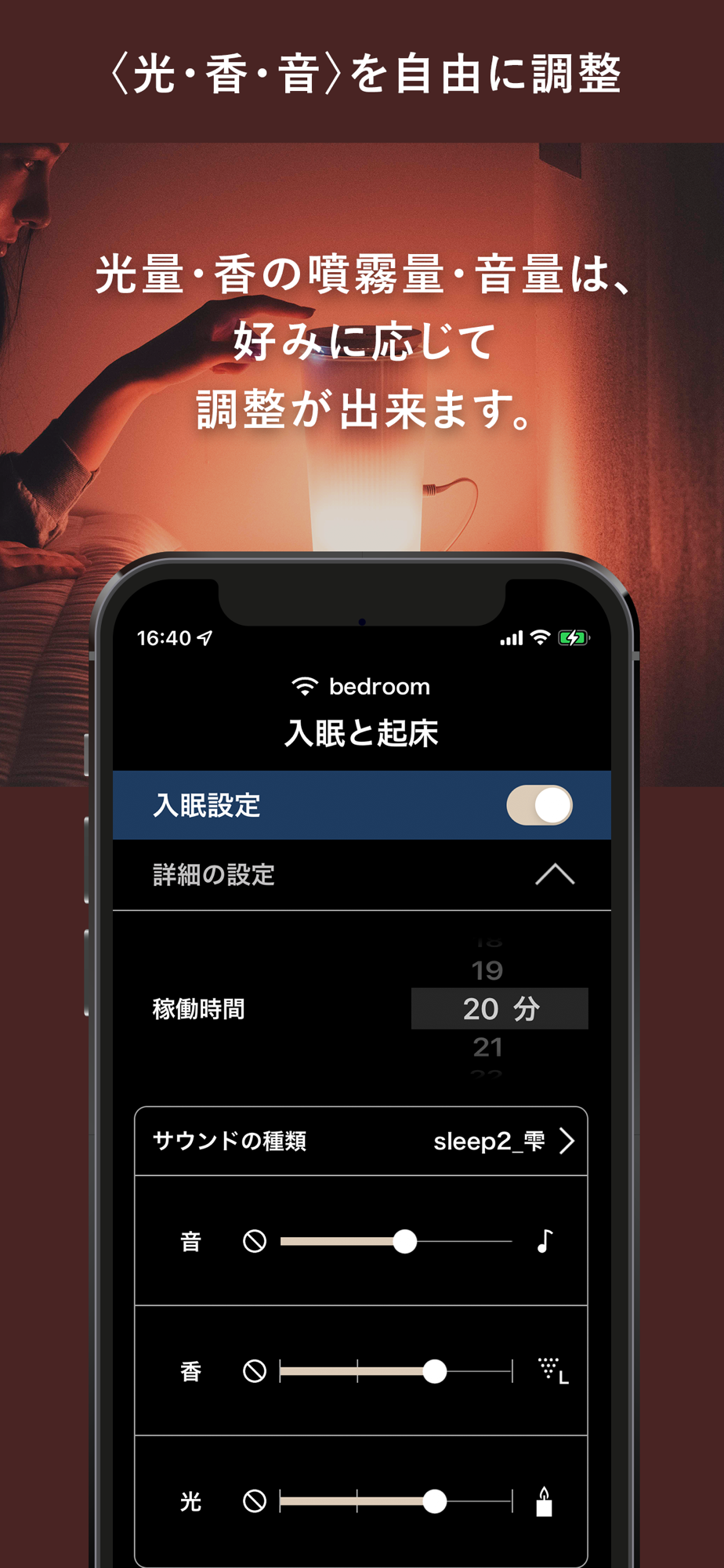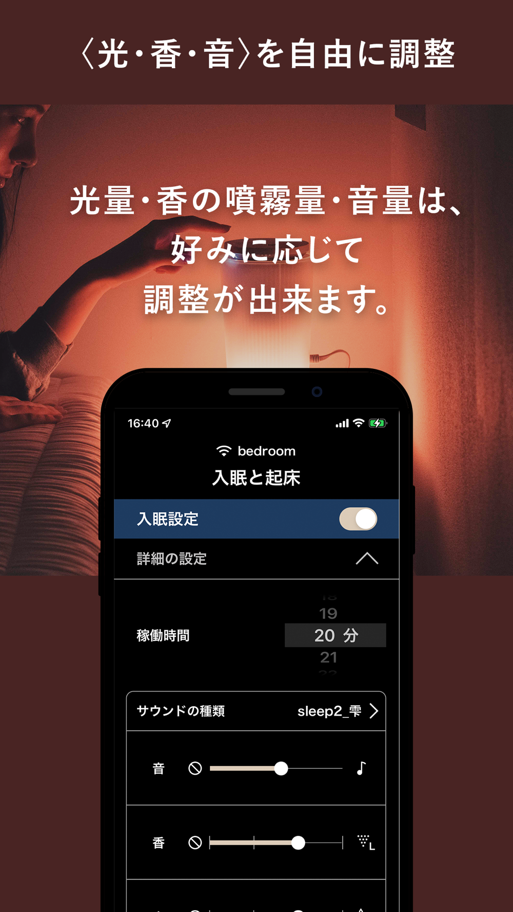 ・サウンドの種類、音量、香りの噴霧量、光の強さを変更できます。
