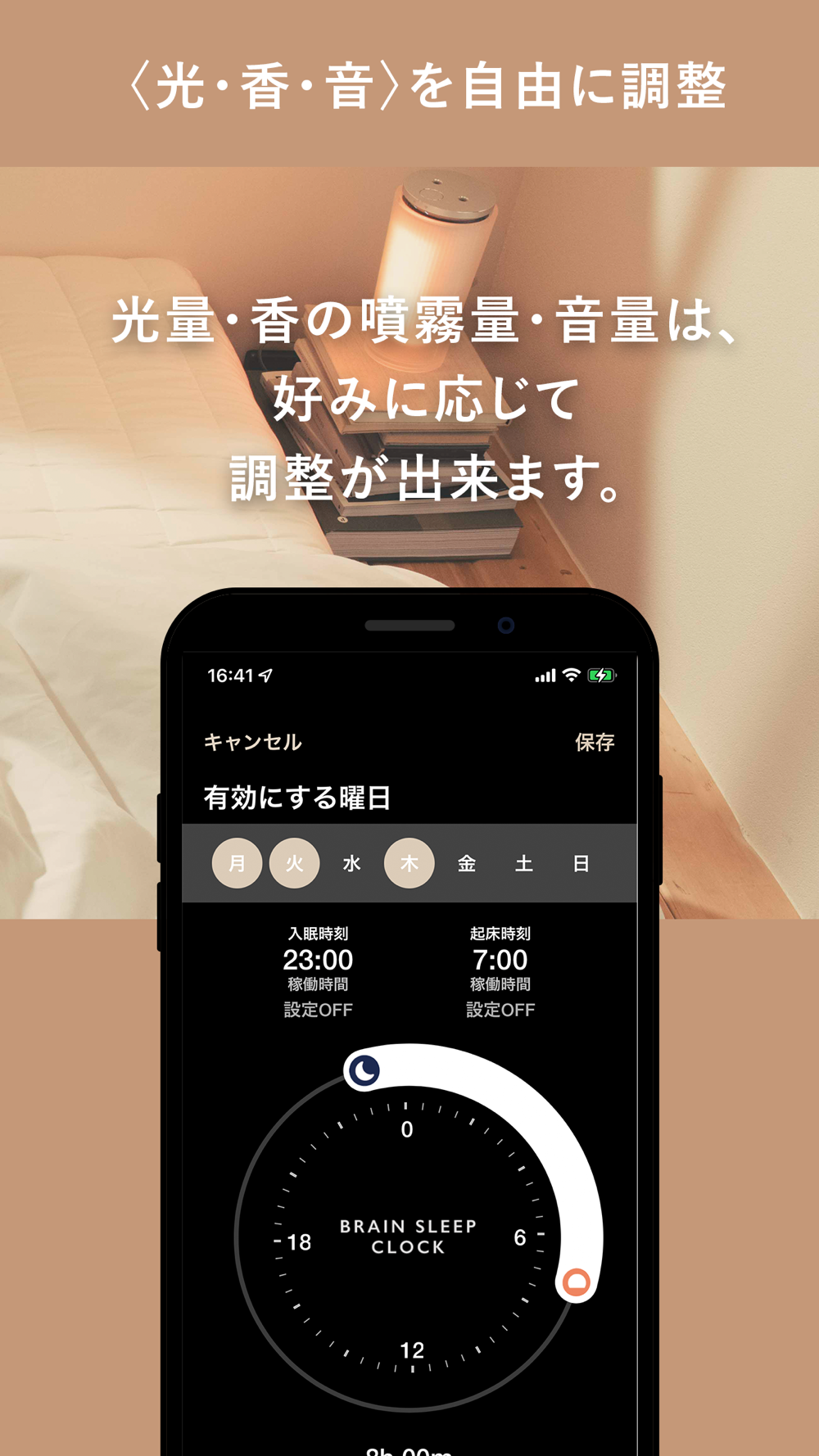 ・入眠動作の開始時刻と起床時刻の設定を行えます。