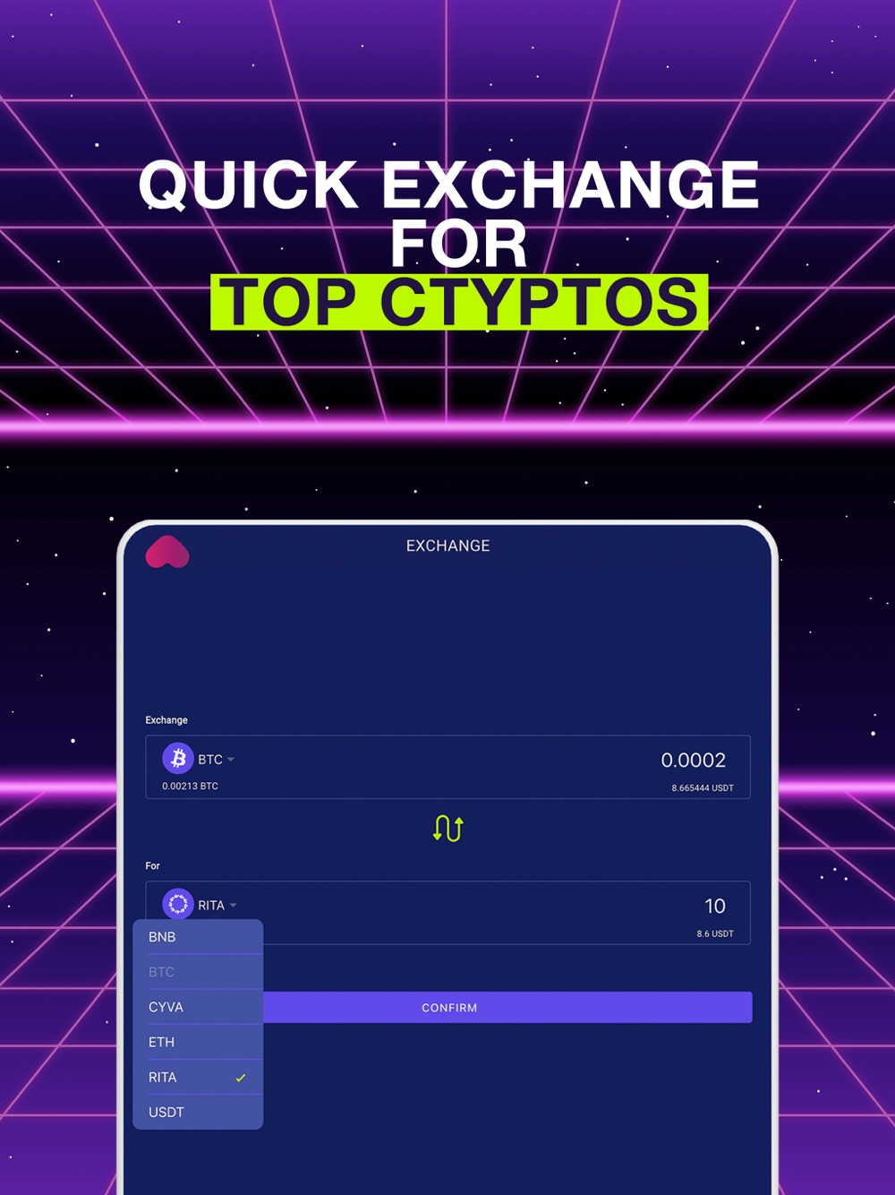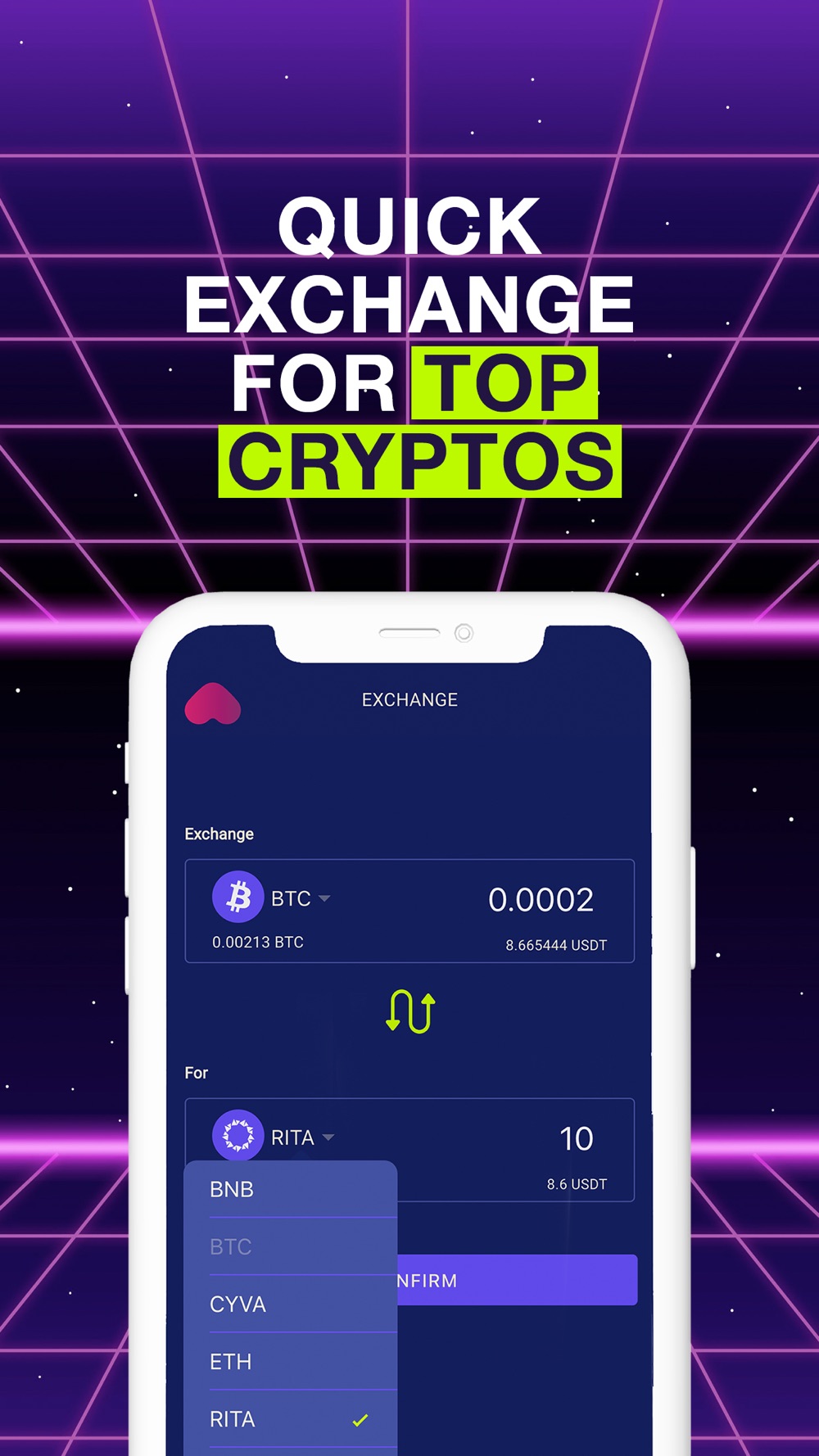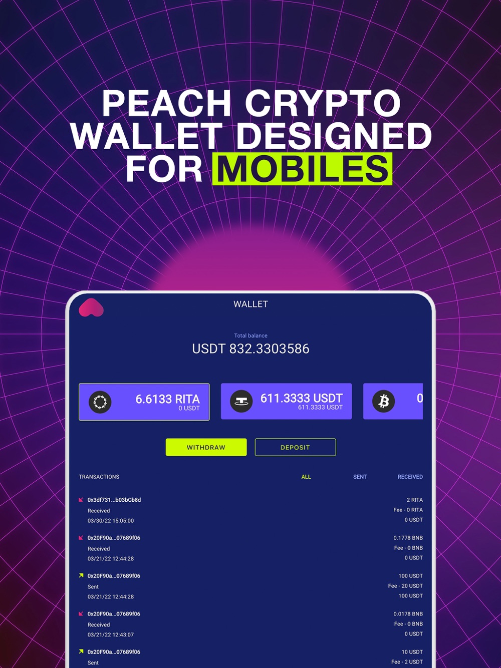 Peach is a crypto wallet application designed for mobiles to make transactions of top cryptocurrencies including RITA coin. As a multiwallet, Peach enables you to exchange and transfer various coins, make deposits and withdrawals. A distinguishing feature of Peach wallet is the possibility to make profit by staking RITA coins. Peach Wallet application has a user-friendly interface and solid security system, which keeps your assets safe and secure.